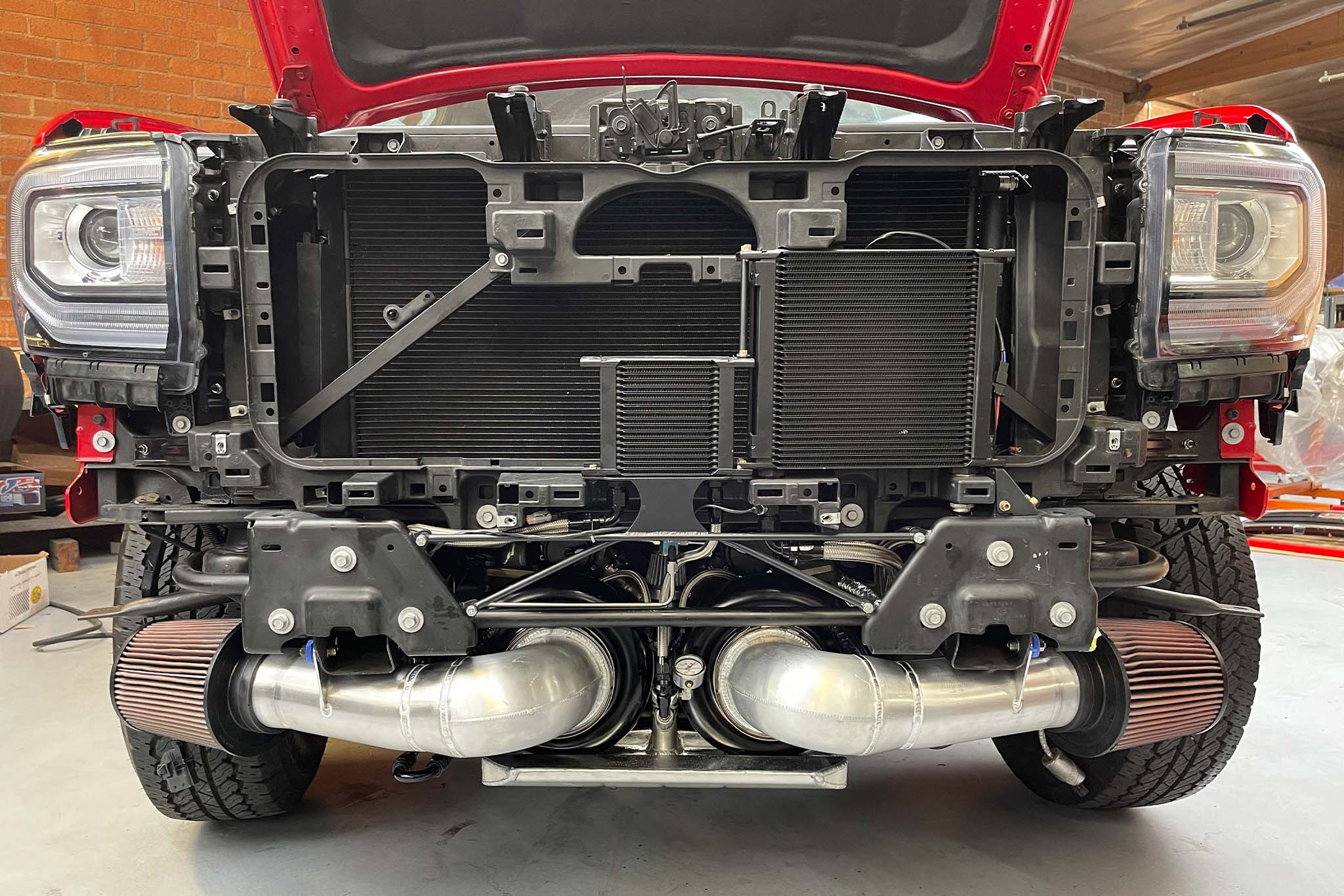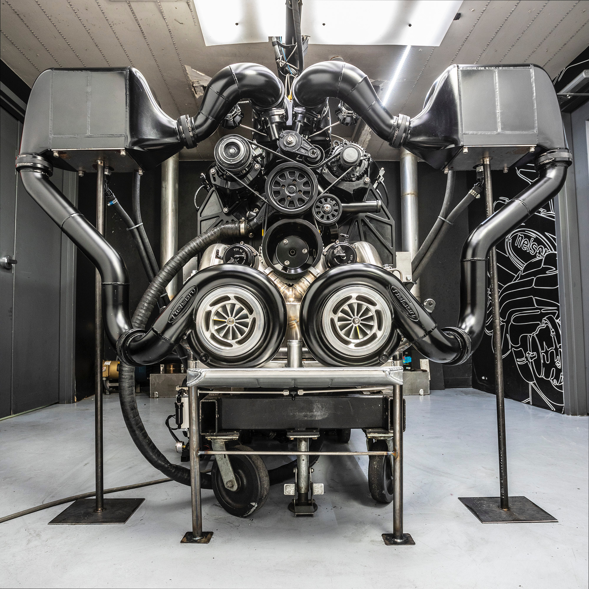 The 632-cubic-inch big-block is force-fed by a pair of 88-millimeter NRE Mirror Image turbos. The blowers even have their own standalone oil system because they’re mounted so low. It doesn’t stop there, as Nelson says, “We also designed from billet some really trick water air intercoolers that came out like art and have their own cooling system in the bed of the truck.” There’s also what Nelson calls “one of a kind BAMF dual drive-by-wire throttle body intake manifolds”—I’ll let you figure out what that acronym stands for yourself.