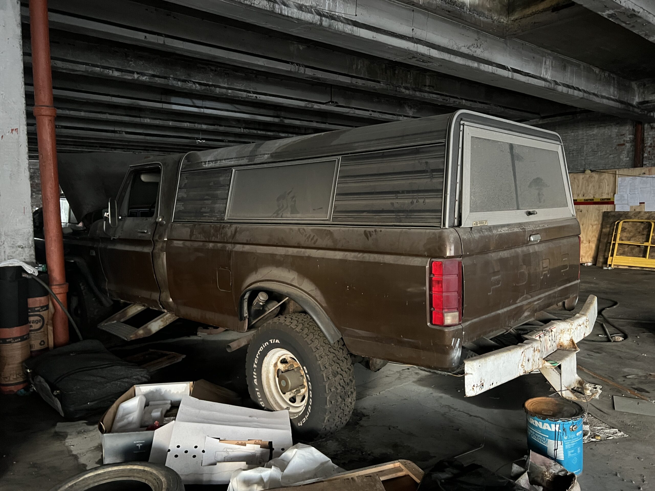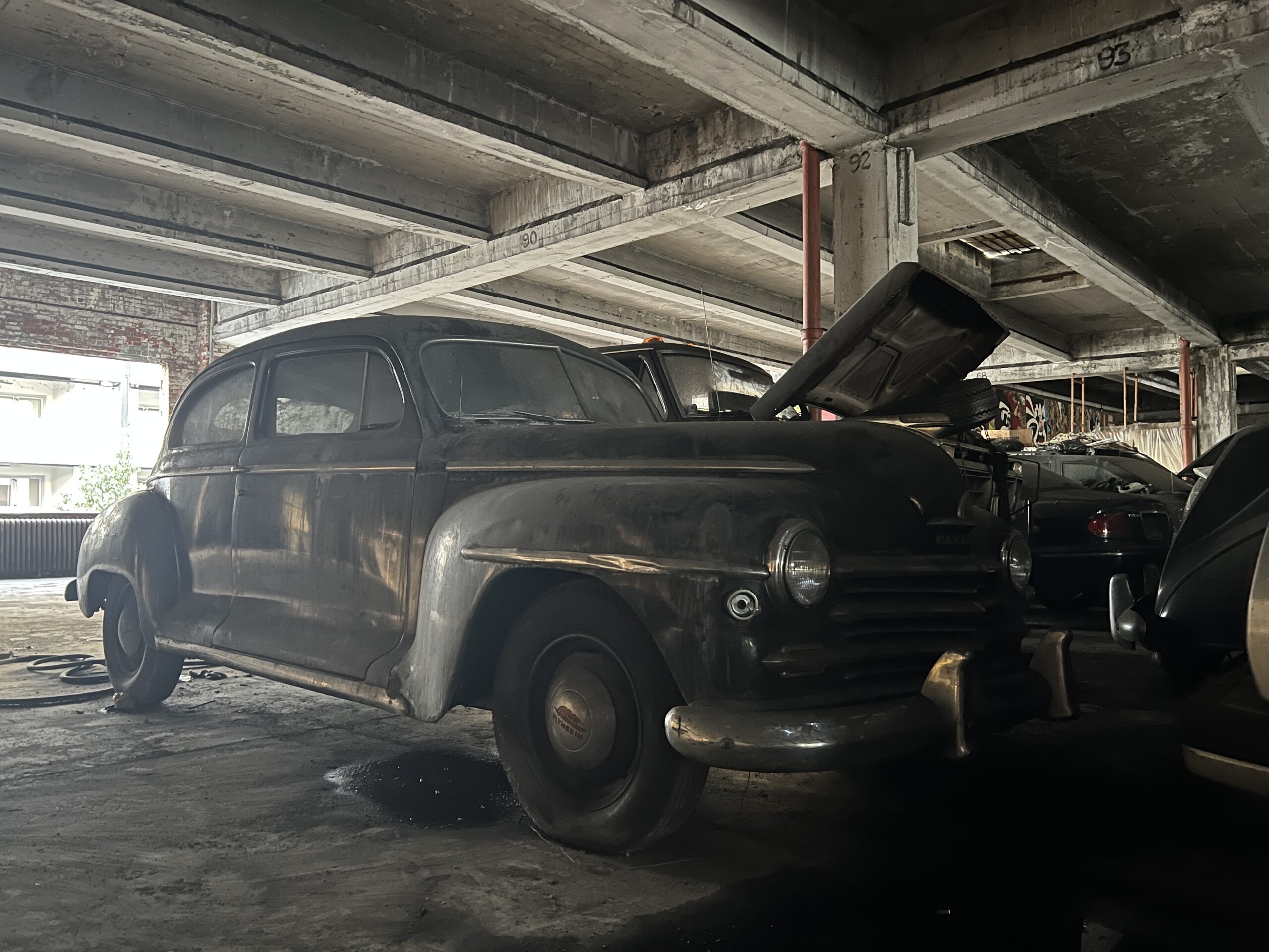“You’re not going to get murdered, I promise,” Chris said as we ascended the main ramp to the garage’s second story. It was nearing dusk, and light filtered in through holes where windows were recently removed in prep for demolition. As we reached the landing and round the corner, I spotted a Volkswagen Karmann Ghia half-covered by a tarp—behind it, a red Triumph Spitfire and a ‘64 Cadillac. But we’re just getting started. Behind the Cadillac sat an Austin Princess limousine, a tan-on-tan ‘49 Chevy convertible, and a Plymouth of similar vintage. A coffee-colored late-’70s Ford pickup and a Datsun 280ZX rounded out the treasures on this floor, though there were at least a dozen more pedestrian vehicles scattered around. It’s overwhelming, and I took refuge in the office before continuing the tour.