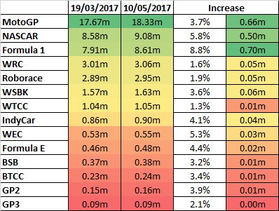 Online followers are only one metric to gauge a fanbase by, unless you are MotoGP, where seemingly every fan in the world follows them online. A 16.5% increase in over a little more than two months is a very good sign for IndyCar, so long as they keep those new fans around. IndyCar does a fantastic job with their social media accounts. If something happens on track, they have a reply up usually within minutes, and they keep their online fans engaged. So long as they keep having good races on track, keeping these new followers shouldn’t be a problem.