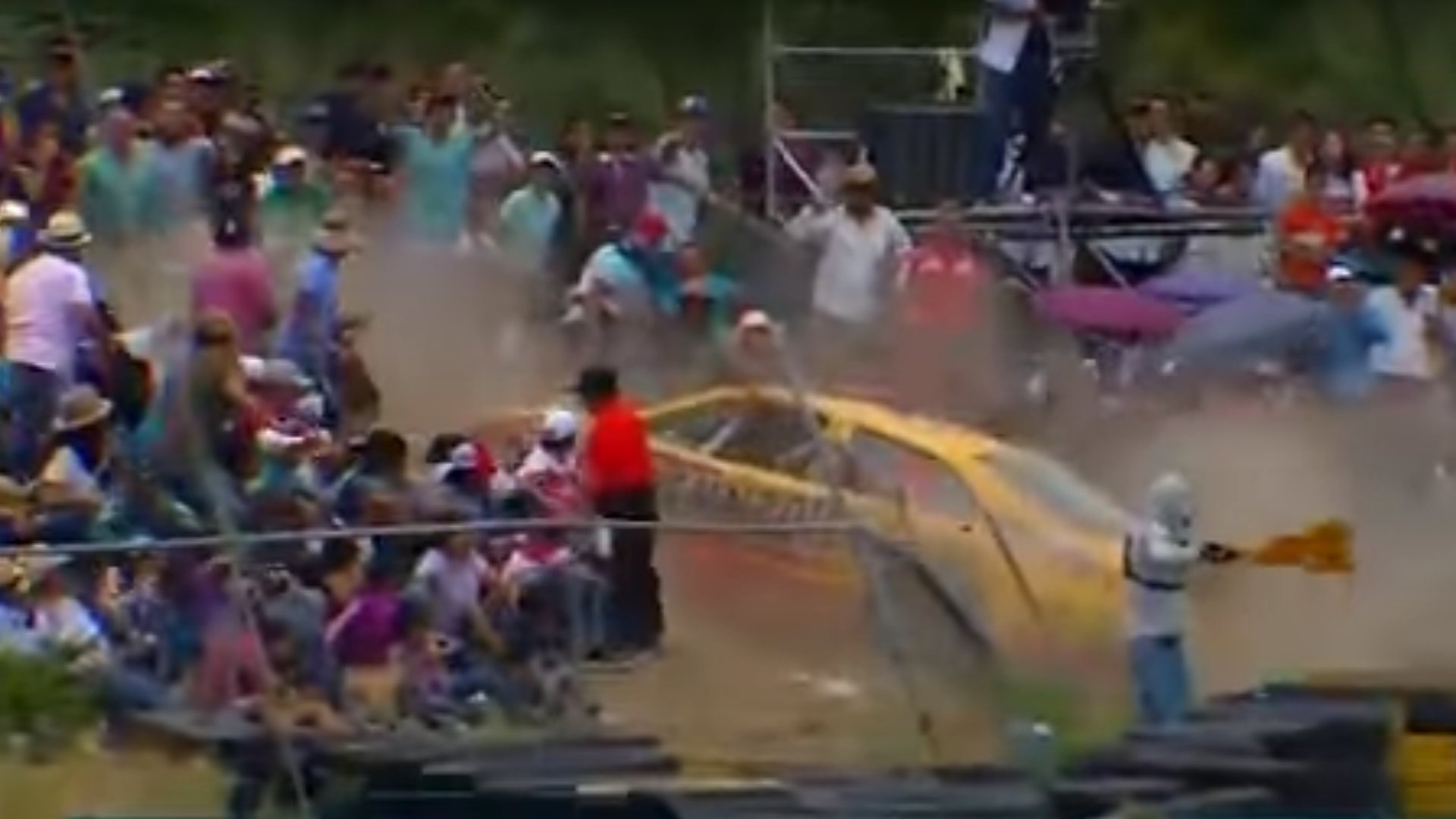 A scary scene went down at last weekend’s NASCAR PEAK Mexico race at the Autódromo de León when driver Santiago Tovar lost his brakes going into the track’s final turn, causing his #26 Pennzoil car to fly off the track, punch through a tire wall, and plow into a group of spectators. Four people were treated for minor injuries at the scene.