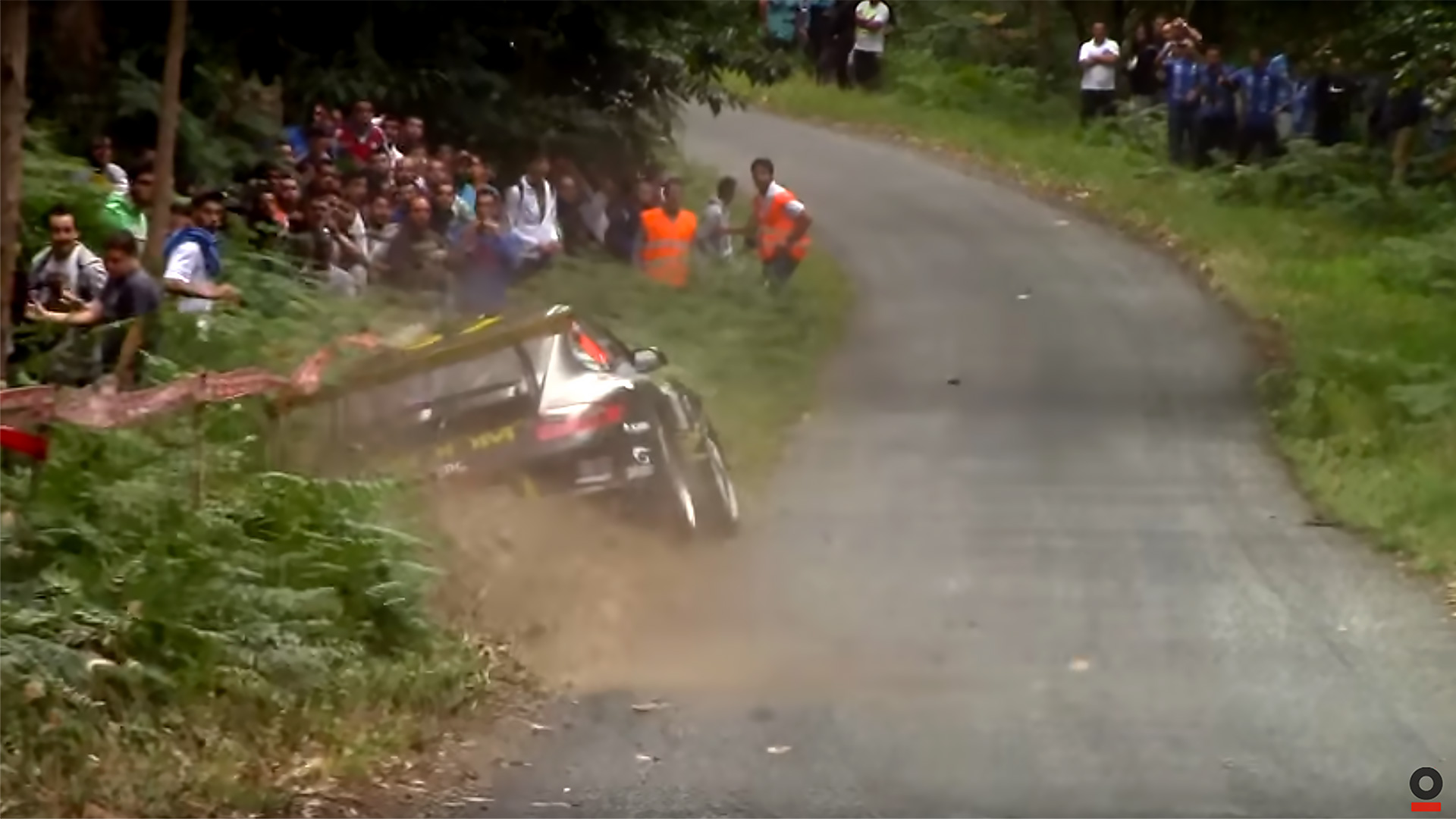 The driver in the Porsche GT3 rally car clearly approached the crest way too hot, but managed to stick one of the sketchiest landings we’ve ever seen. The chassis bottomed out, sending shards of fiberglass from the front lip and side skirt flying to the left before the car veers into the ditch. Suddenly, it’s on a deadly trajectory, pointing straight into a crowd of spectators. Remarkably, the driver in the Porsche manages to slough enough speed and steer right quickly enough to avoid tagging the scattering, screaming mob of rally fans.