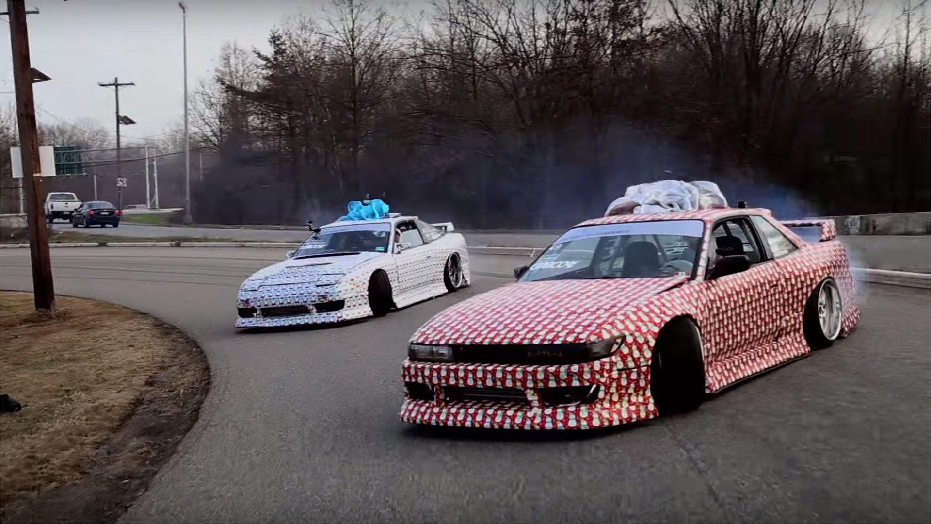 The jokers of Faction Motorsports got in the holiday spirit by completely gift-wrapping their slammed Nissan S13s in colorful holiday themes before taking them sideways around the neighborhood. The Frosty the Snowman steering wheel cover and super-size bows are savvy touches.