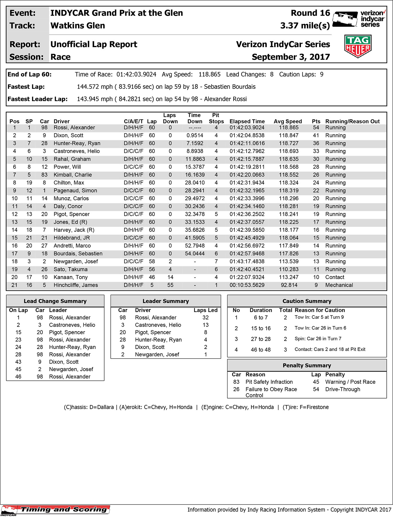 At the end of the day, seven drivers are still mathematically in contention to win the championship. Newgarden leads with 560 points. Behind him there is Dixon (-3), Castroneves (-22), Simon Pagenaud (-34), Will Power (-68), Rossi (-84), and Graham Rahal (-94). There are so many ways things could play out at Sonoma. We will be crunching the numbers in the coming days to explain it all. Needless to say, it’s going to be a great race to end the 2017 IndyCar season.