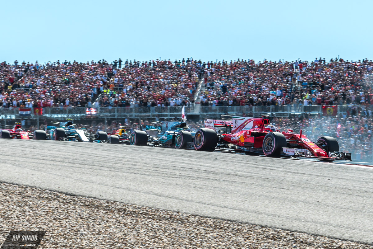A back and forth race at the top kept things interesting from the start with Raikkonen and Bottas joining in on the fun as the contest went on. Vettel took the lead into turn one, keeping first place for the first six laps before being overpowered by Hamilton. P4 starter Daniel Ricciardo was in the mix as well until a blown engine forced him to retire before getting a real shot at the race win. However, the number one spot came down to Hamilton and Vettel who both returned to their prior form to give the American crowd the show they wanted.