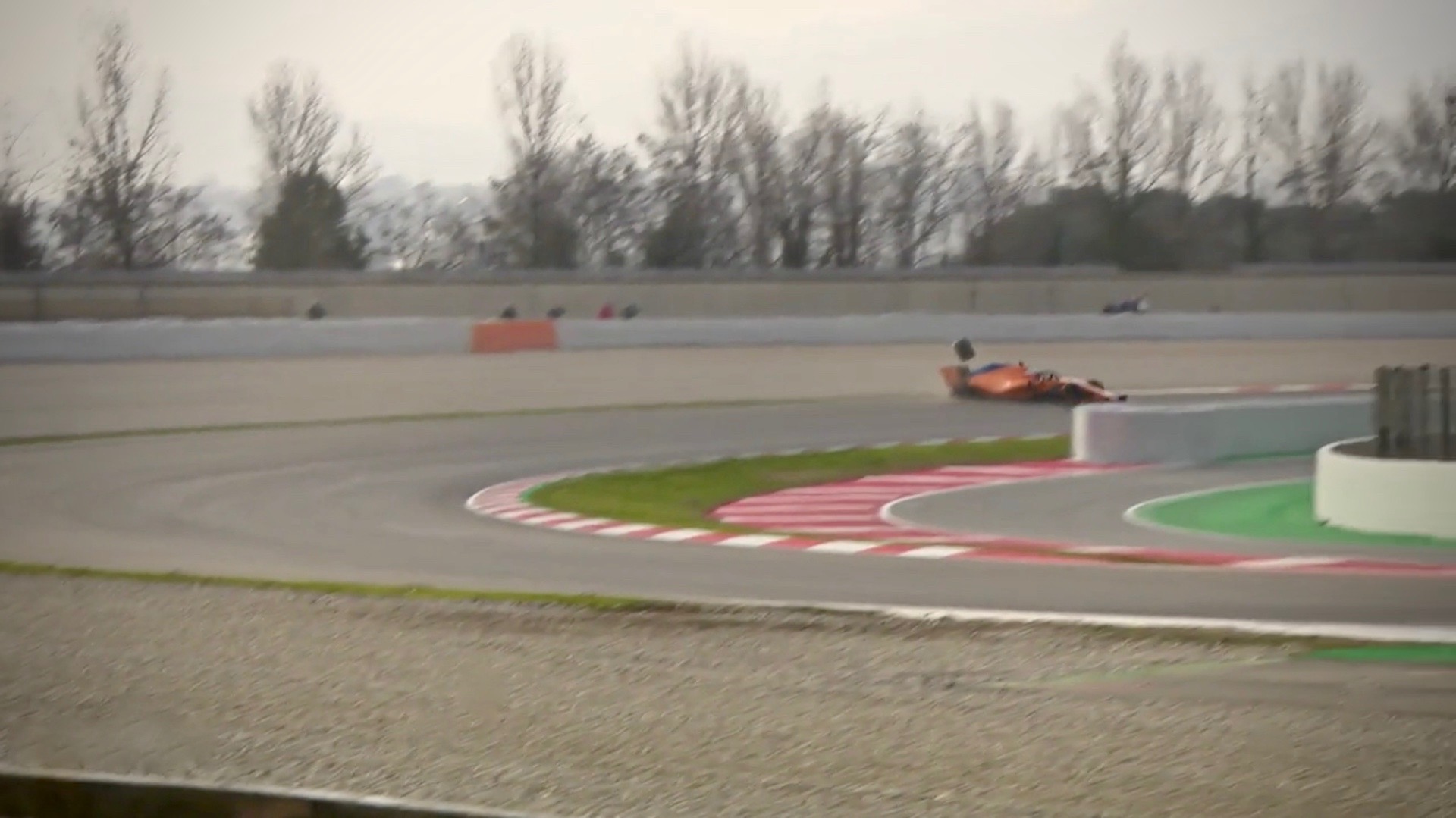 The video of the accident shows Alonso tackling the chicane at what appears to be a fairly strong pace, but soon thereafter, the rear end of the MCL33 begins to break away as Alonso sets up for the next right-hander. Suddenly it all goes wrong, the right rear wheel goes up in the air, he loses control and quickly does a 180-degree spin into the gravel trap.
