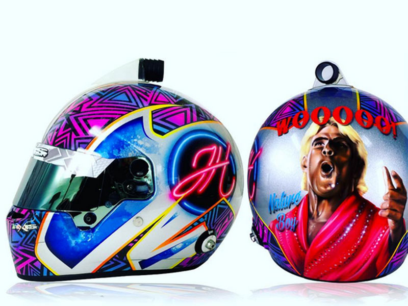 When NASCAR Camping World Truck Series driver John Hunter Nemechek was born, “Nature Boy” Ric Flair’s professional wrestling career was winding down. But that didn’t stop the 18-year-old driver, who snagged his first top podium spot last year at Chicagoland Speedway, from emblazoning his helmet with a heap of Eighties neon and a custom image of the WWF superstar. Does the design look like it’s from that ramshackle airbrush store that’s constantly moving locations at your local mall? Damn right it does. Does that make it more awesome? Indeed.