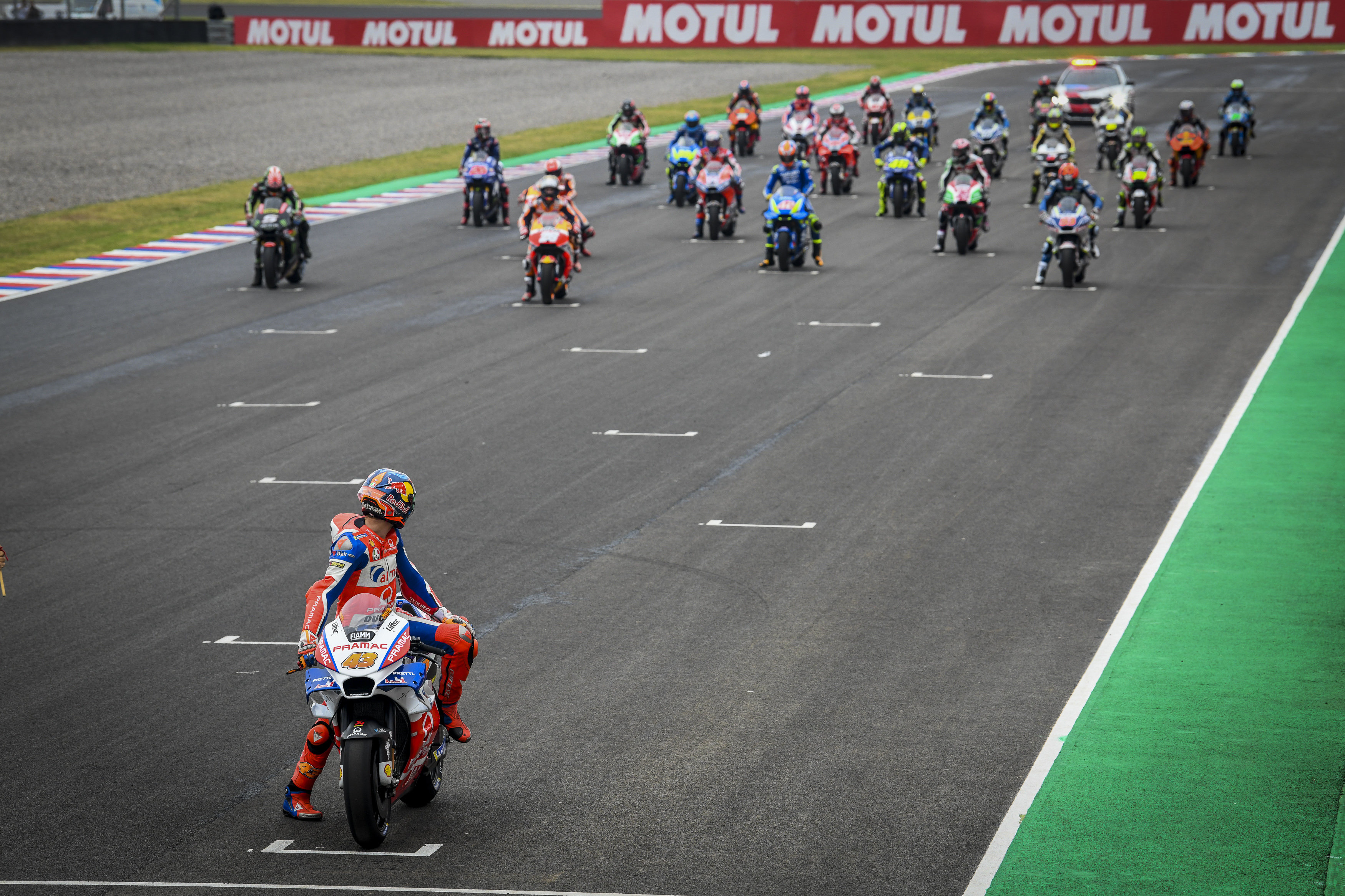 It all started before the race got underway as a light shower soaked the 2.9-mile circuit and triggered pandemonium that saw most MotoGP riders, except pole-sitter Jack Miller, switch to wet tires for the start of the race. The rules state that riders with last-minute changes applied to their motorcycles must start from the pit lane, but due to the majority of the field having to comply, the race director allowed the field to line up on the starting grid several rows behind Miller, therefore still respecting the headstart the Australian deserved for not pitting.