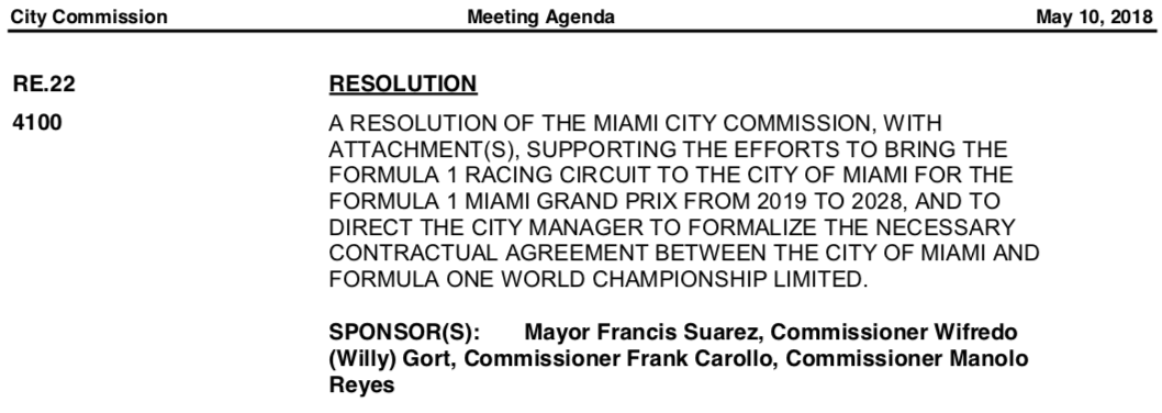 The matter will be brought before the City Commission on Thursday, May 10, where it will be sponsored by the city’s Mayor Francis Suarez, among others. The agenda for the meeting reveals that the intended hosting contract will run for a decade, between 2019 and 2028. Tentative plans are to hold the first Miami Grand Prix in the window of October 2019, likely alongside Texas’s United States Grand Prix’s spot on the race calendar.