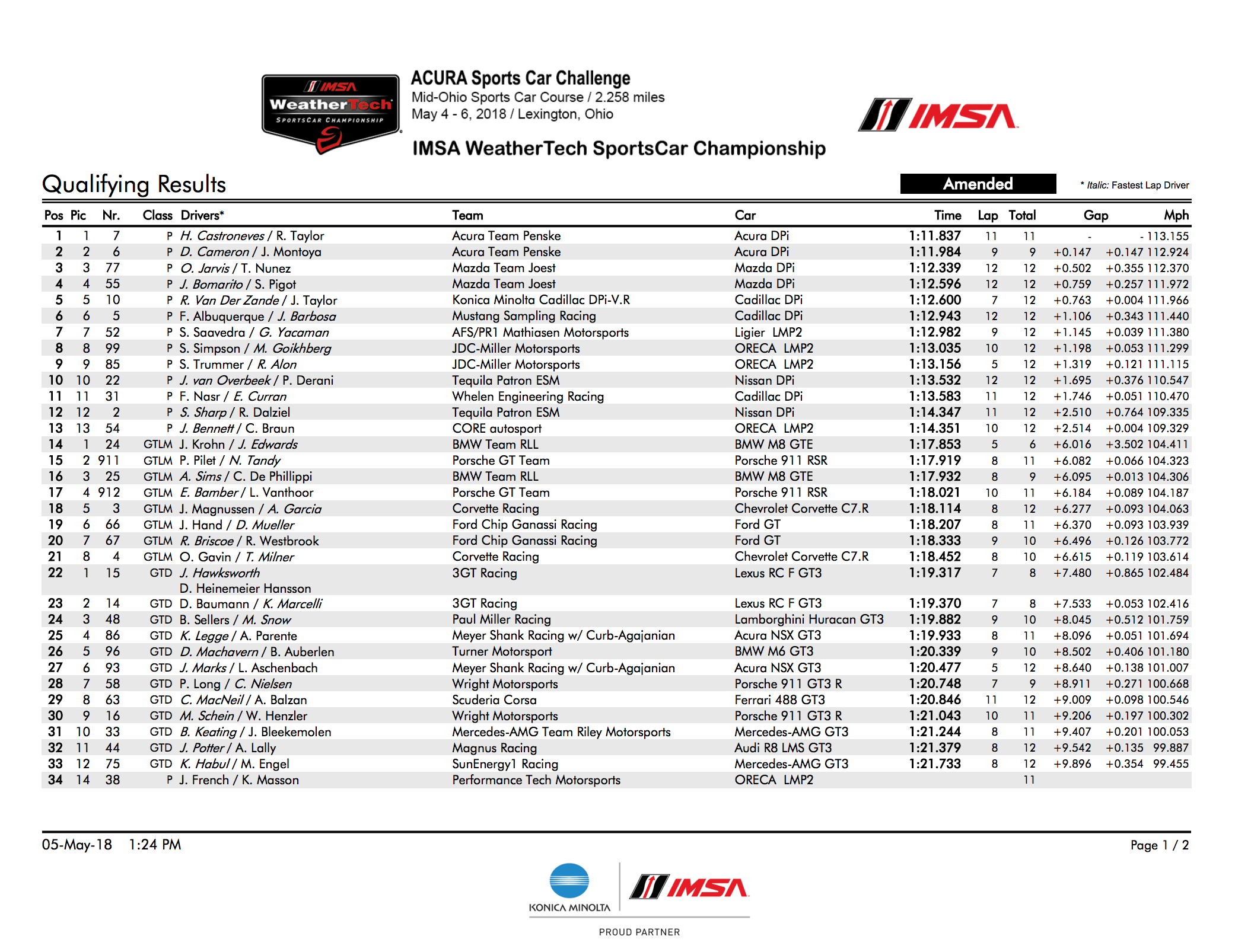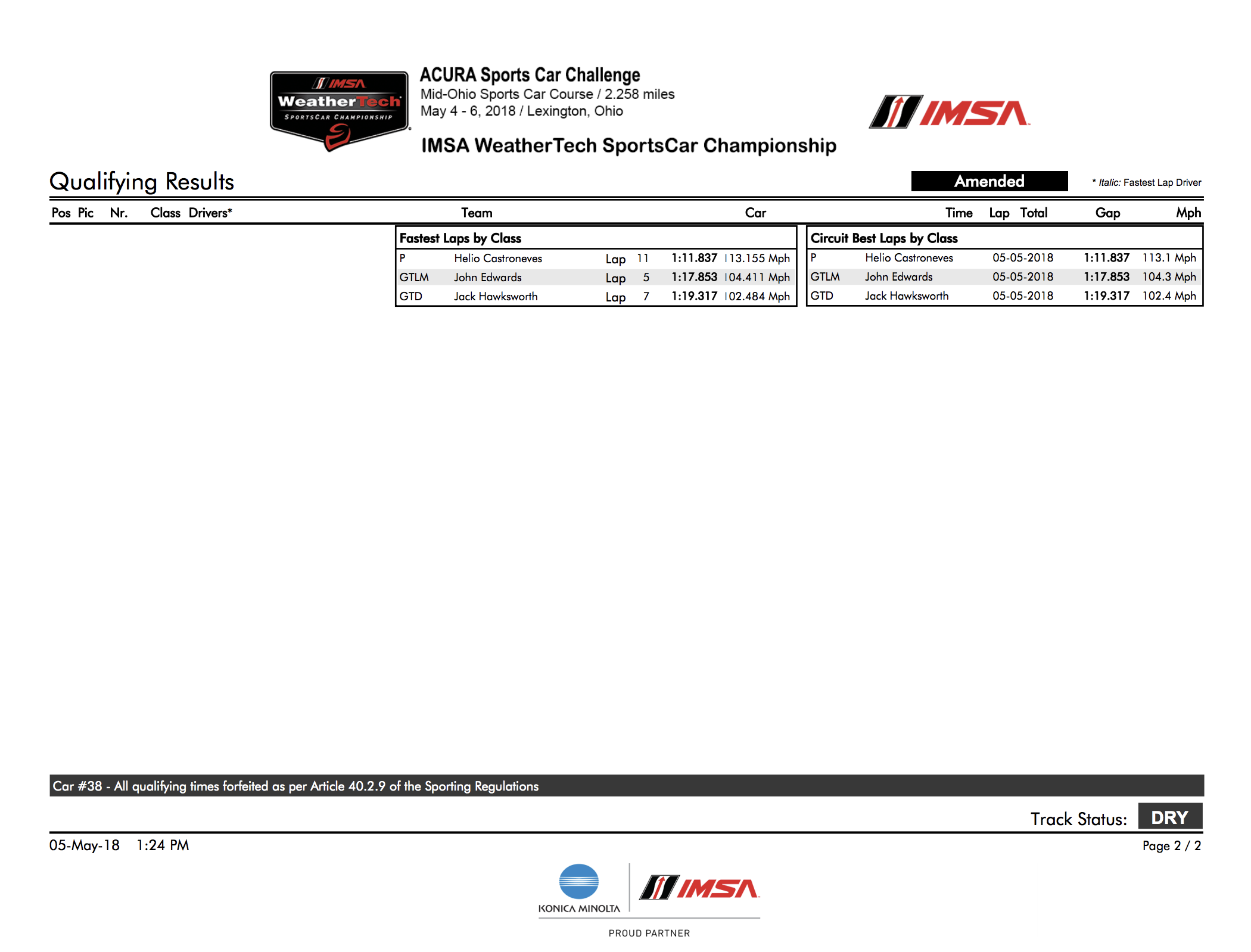 “I had a Facebook reminder this morning that it has been a year to the day since my last pole (COTA, 2017) so I guess I had a little extra motivation today to go out and do it,” Edwards said at Saturday’s end. “It was a very tight session and it is going to be a very tough fight tomorrow. With traffic, you never know what is going to happen so when we start catching up GTD cars and Prototype cars start catching us it’s going to throw a wrench into the works. With rain predicted towards the end of the race, nothing is a given but it is very nice to be starting out front.”