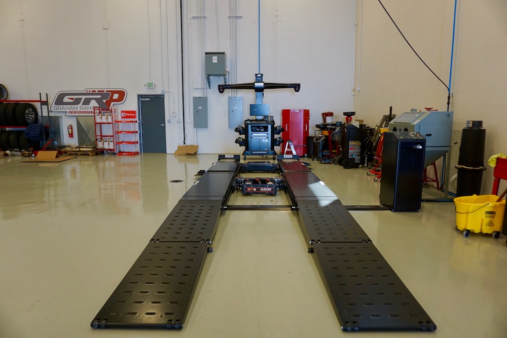 I arrive on location early to take a few photographs, and it’s not long before Rahal pulls up at the wheel of his Ford F-150 Raptor, the very same one you can see suspended on a lift getting bigger Brembo brakes installed in some of these pictures. Unlike many performance shops, GRP is egalitarian—they work on everything from high-end sports cars like Porsches and Mercedes-AMGs to something like the Honda Civic Type R. But more on that later.