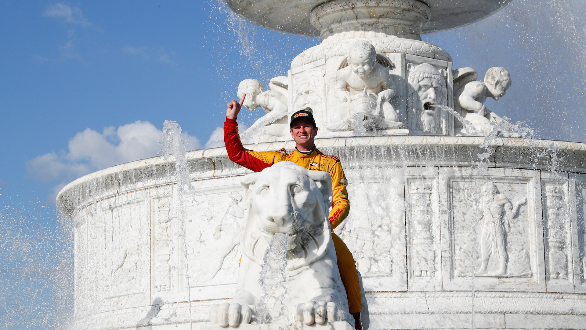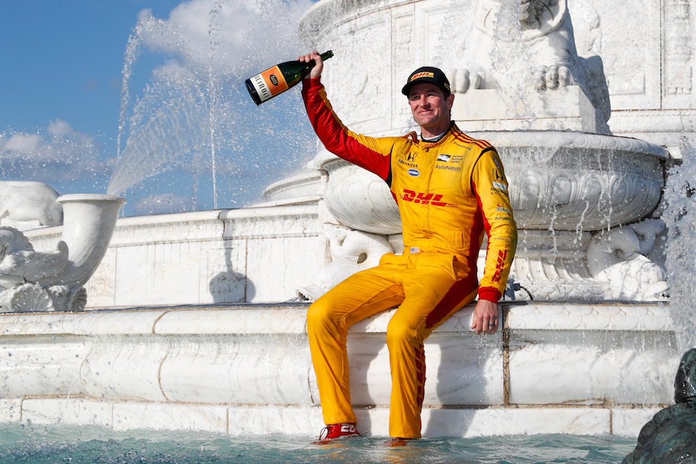 Andretti Autosport’s Ryan Hunter Reay celebrated his dominant victory at Sunday’s IndyCar Chevrolet Detroit Grand Prix by jumping into the James Scott Memorial Fountain in Belle Isle Park. As it turns out, he had made a promise to do so earlier during the week.