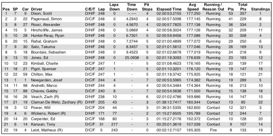 Further back in the pack were Hinchcliffe, Ryan Hunter-Reay, and Graham Rahal who wrapped up the top six, and Takuma Sato, Sebastien Bourdais, Ed Jones, and Charlie Kimball who secured their respective spots in the top ten, and in turn, valuable points for the championship. Today’s results move Dixon to the top of the championship with 357 points, Rossi in second with 334, and Power in third with 321.