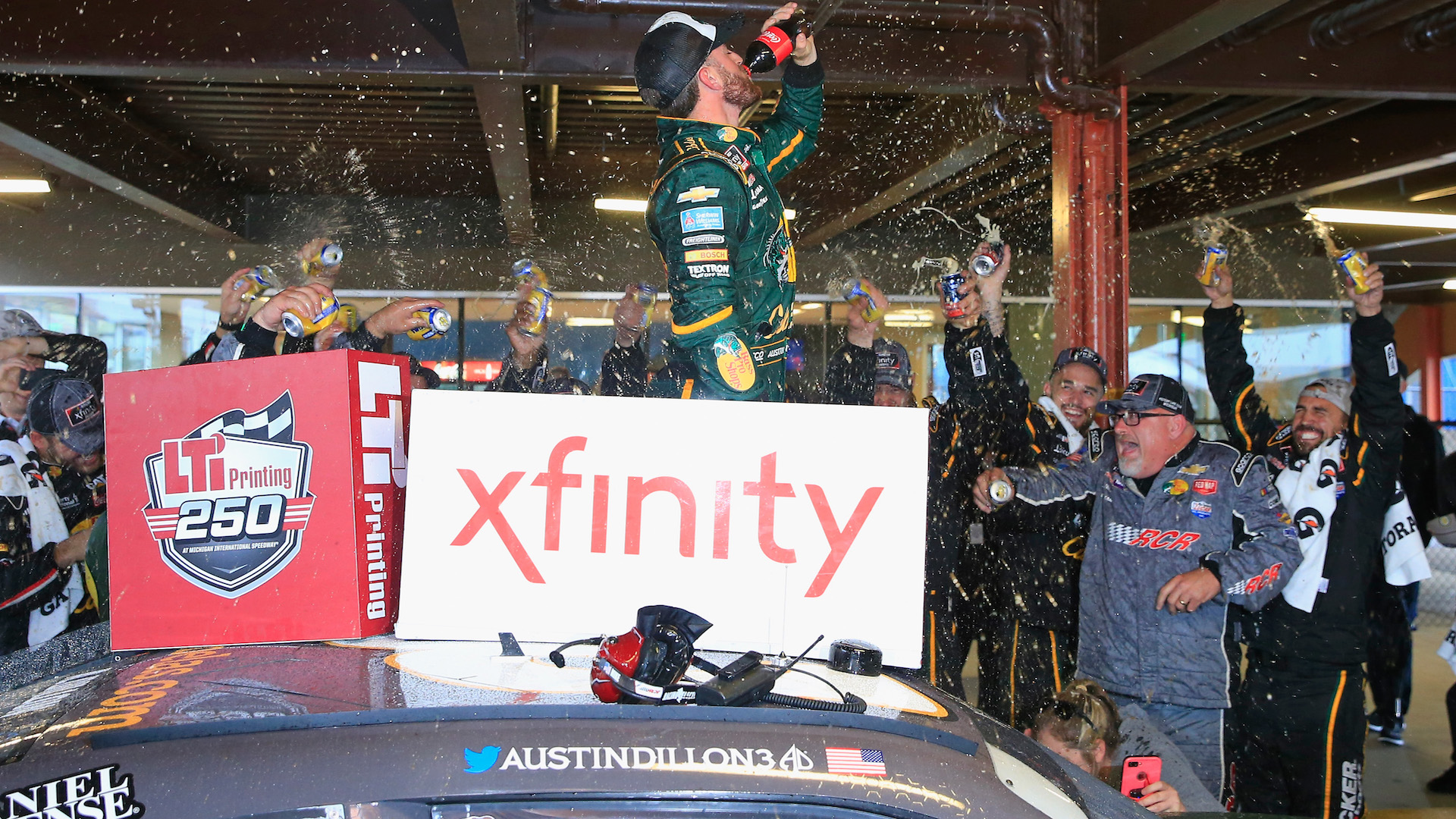 Rain made its mark on the NASCAR Xfinity Series schedule at Michigan International Speedway on Saturday, forcing the cancellation of qualifying, delaying the start of the 2018 LTi Printing by about three hours, and resulting in the shortening of the race from its planned distance of 125 laps to just 91. Austin Dillon counted on that rain when he elected to stay out on the race track during a string of late-race cautions instead of pitting for fuel. The rain came just in time with Dillon up front with a nearly dry fuel cell when the race was called “official” by NASCAR on lap 91.
