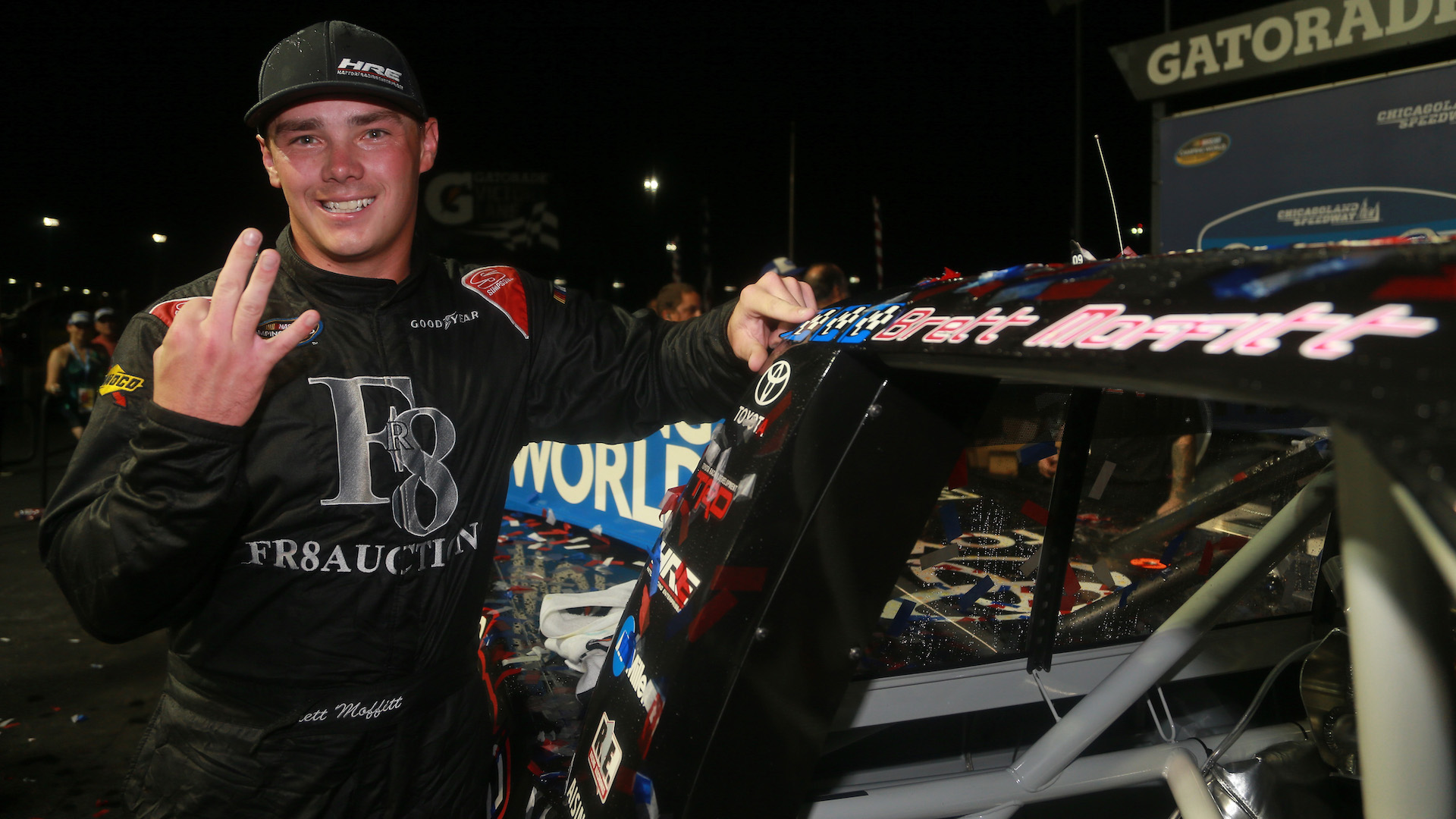 , Brett Moffitt takes the checkered flag in the Overton’s 225 at Chicagoland Speedway on June 29, 2018., Getty Images for NASCAR“I have to thank Fr8Auctions, our partners at TRD and Toyota that have gotten us to this point in the year and Shige Hattori [team owner],” Moffitt said. “This is great. We didn’t know if we were coming like you said. To be here in victory lane, it’s an honor and a blessing. These guys work hard. I feel like we threw away a couple of wins this season. I hate it for the No. 8 [John Hunter Nemechek], whatever happened to him, but we’ll take it however we can get it right now.”