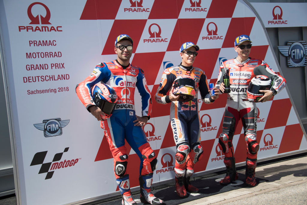 Repsol Honda’s Marc Marquez continues to sweep the 2018 MotoGP season, this time by claiming his ninth pole position at the famous Sachsenring in Germany. The Spaniard beat Pramac’s Danilo Petrucci by just 0.025 seconds, and Ducati’s Jorge Lorenzo by 0.032.