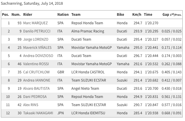 After the climactic qualifying session, it’s Ducati’s Andrea Dovizioso and Yamaha’s Valentino Rossi who wrap up the top six, which is composed of a Honda, Ducati (satellite), Ducati, Yamaha, Ducati, and Yamaha.