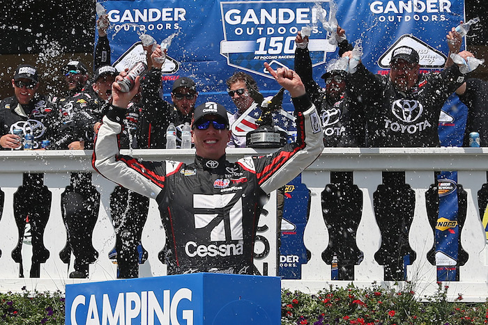 , Kyle Busch celebrates in victory lane at Pocono Raceway after winning the Gander Outdoors 150 on July 28, 2018., Getty Images for NASCARThe win at Pocono came down to a battle between Kyle Busch Motorsports teammates. Erik Jones, in a substitute role for the ill Noah Gragson, closed on Busch in the final 10 laps of the 60-lap race but was unable to pass his boss.