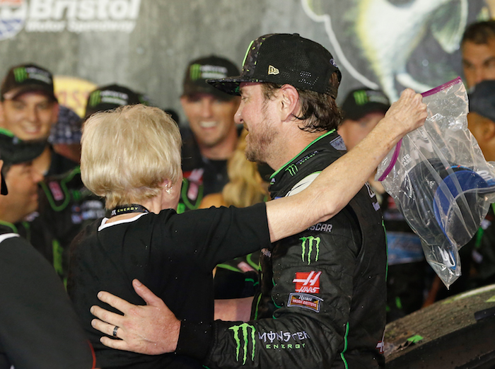 , Kurt Busch receives a congratulatory hug from mom, Gaye Busch, after winning the Bass Pro Shops NRA Night Race at Bristol Motor Speedway on Aug. 18, 2018., Getty Images for NASCARPole sitter Kyle Larson took runner-up honors after leading laps early and getting back up to second on the final restart with 13 laps remaining.