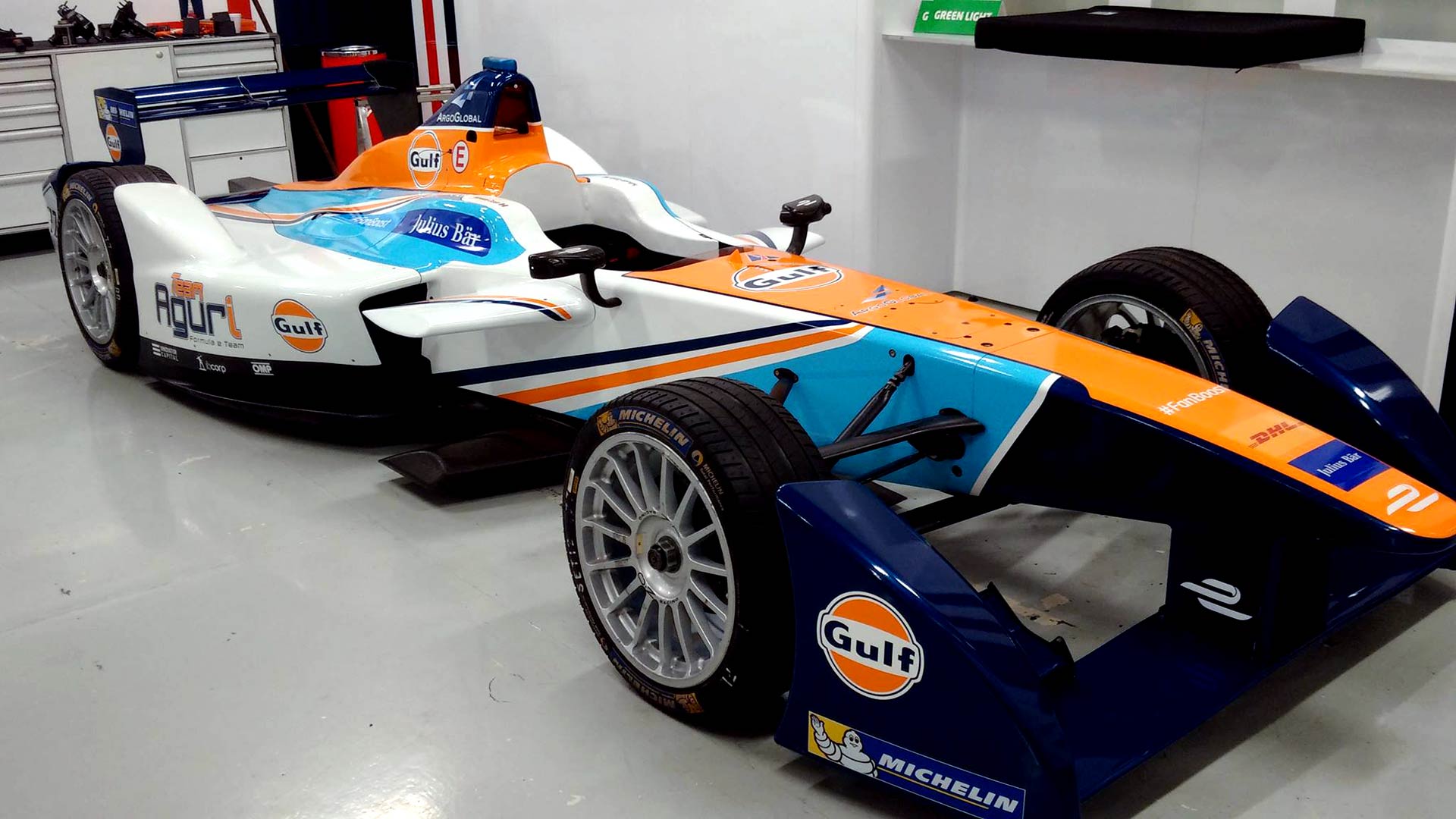 Like a flock of sheep throwing a party for a pack of wolves, Gulf Oil, which is an oil company, has announced that it will sponsoring a racecar in Formula E, which is an all-electric racing series. In celebration of the new partnership, and in homage to Gulf-sponsored racecars of yore (see: Porsche 908, Ford GT40, McLaren F1 GTR, Aston DBR9), the Team Aguri Formula E will wear the classic powder-blue-and-marigold Gulf livery. A wolf in sheep’s clothing? Sort of, if Big Oil could ever be characterized as prey.
