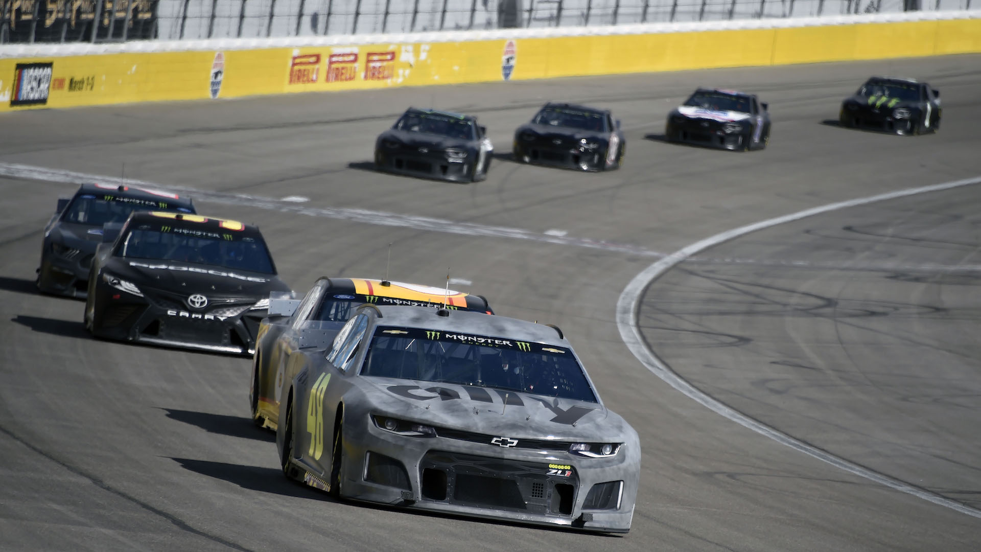 Up to 17 cars were on the track at a time, as the 14 participating teams were joined by at least one car from each of the three manufacturers participating in NASCAR’s top series—Chevrolet, Ford, and Toyota.