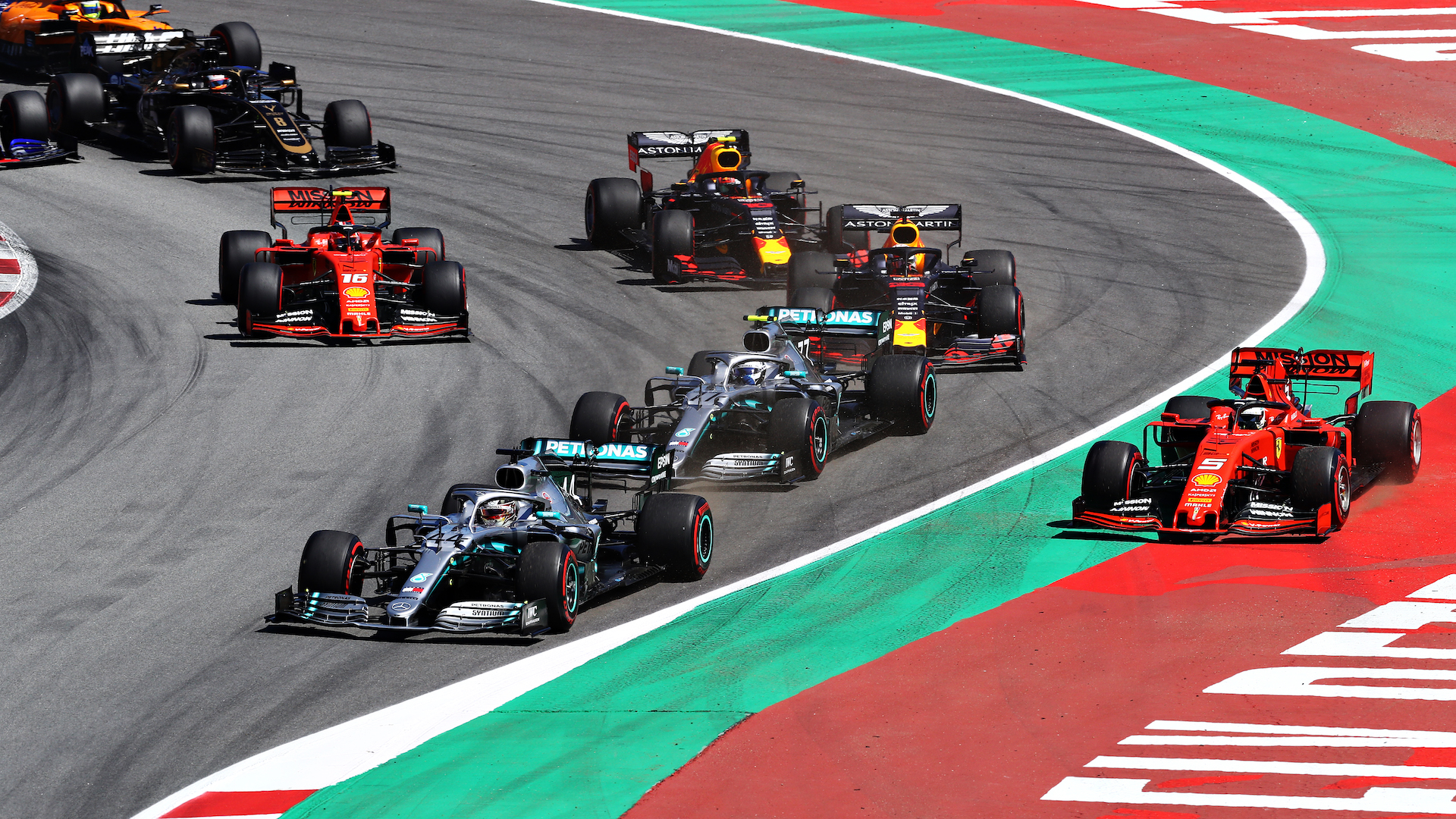 Hamilton started his journey toward the result by scrambling away from the starting line quicker than polesitter Bottas. Both Mercedes entered the first corner alongside one another, and Ferrari’s Sebastian Vettel tried to get in on the action by coming around the outside. But the German locked up and ran out of road, and had to give up the fight on returning to the track, almost losing out to teammate Charles Leclerc. While this went on, Red Bull’s Max Verstappen bided his time, cobbling together a turn two exit that’d launch him around the outside of Vettel and into third.