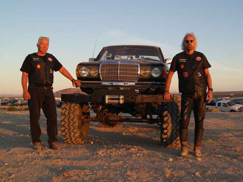 These guys, who built this monster they call the Murdercedes, had this shot taken at sunrise yesterday, the last day of Wasteland Weekend in the California desert. “In December we bought the Mercedes for $450,” says Michael Hughes (right). “My partner in this project is Dean Moreland (left). Dean scrounged up the Chevy Suburban frame, then axles, then the 454 engine.” The Mercedes is a 1984 300D; the chassis, a 1973 Chevy Suburban.