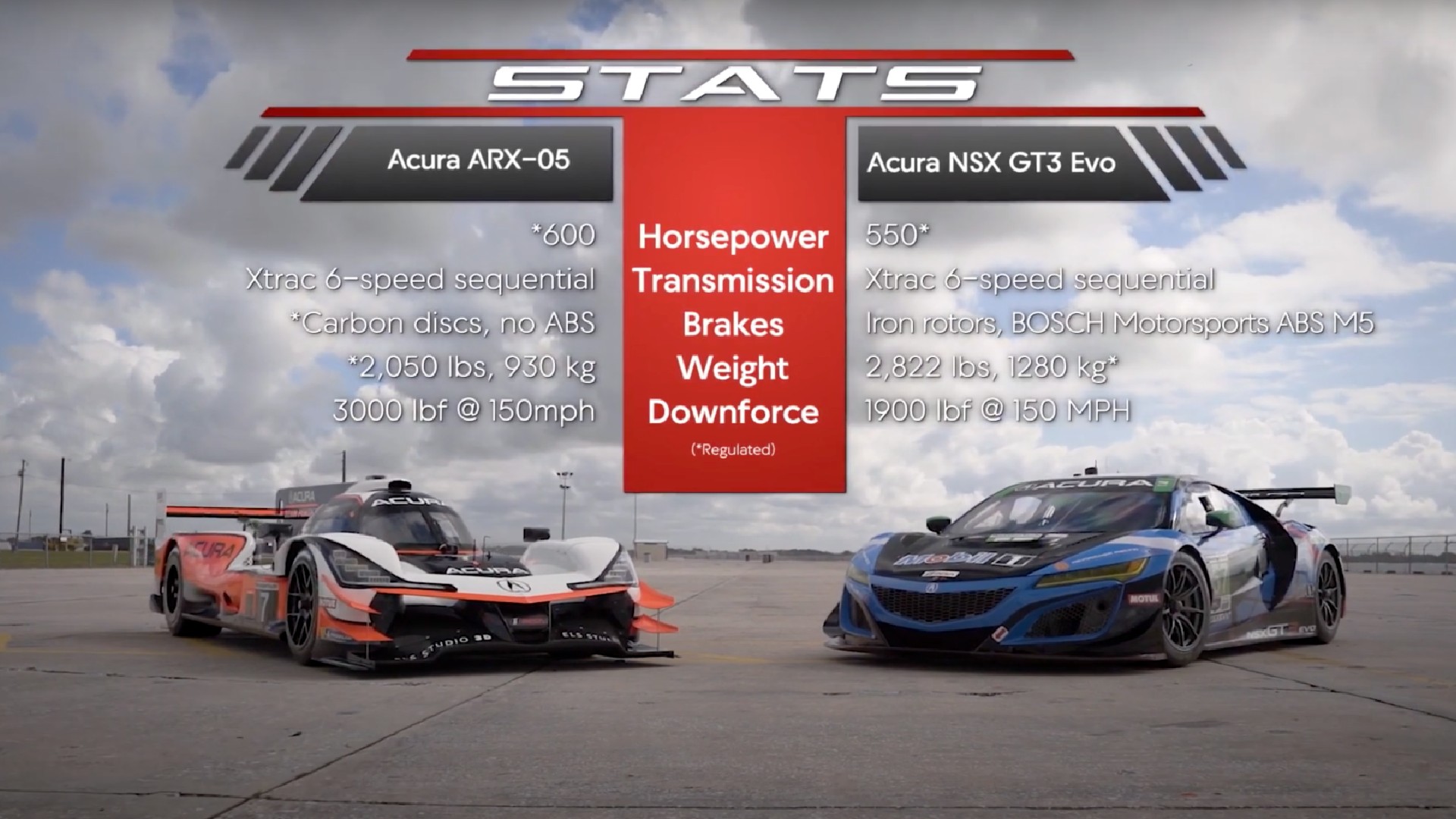 Perhaps the most significant advantage the ARX-05 has over the NSX is downforce. At 150 mph, it produces 3,000 pounds compared to the NSX GTD car’s 1,900 pounds. While the latter is certainly respectable for a production-based car, it can’t hold a candle to the racing-only prototype. Factor in the ARX-05’s touchy carbon brakes and the feel is completely different, as Hindman notes.