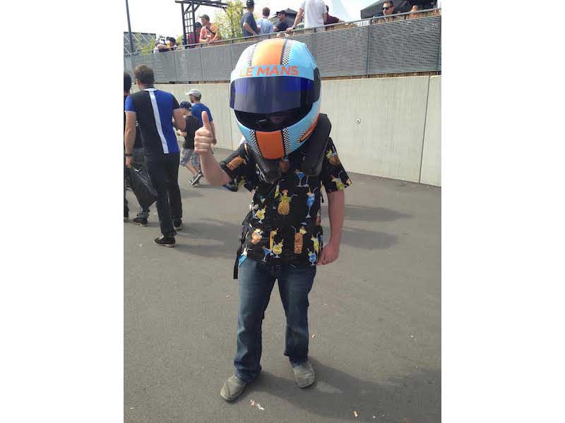 This guy, who’s doing Le Mans right. Why was he stumbling drunk around Bugatti Circuit at noon? Where did he get such an enormous helmet? What fantastical good or unspeakable evil is lurking behind that tinted visor? Not sure, but check out the Hawaiian shirt. Also, the helmet itself, which is in full-fledged Gulf livery. And it’s got a HANS neck safety device, too. C’est un héros.