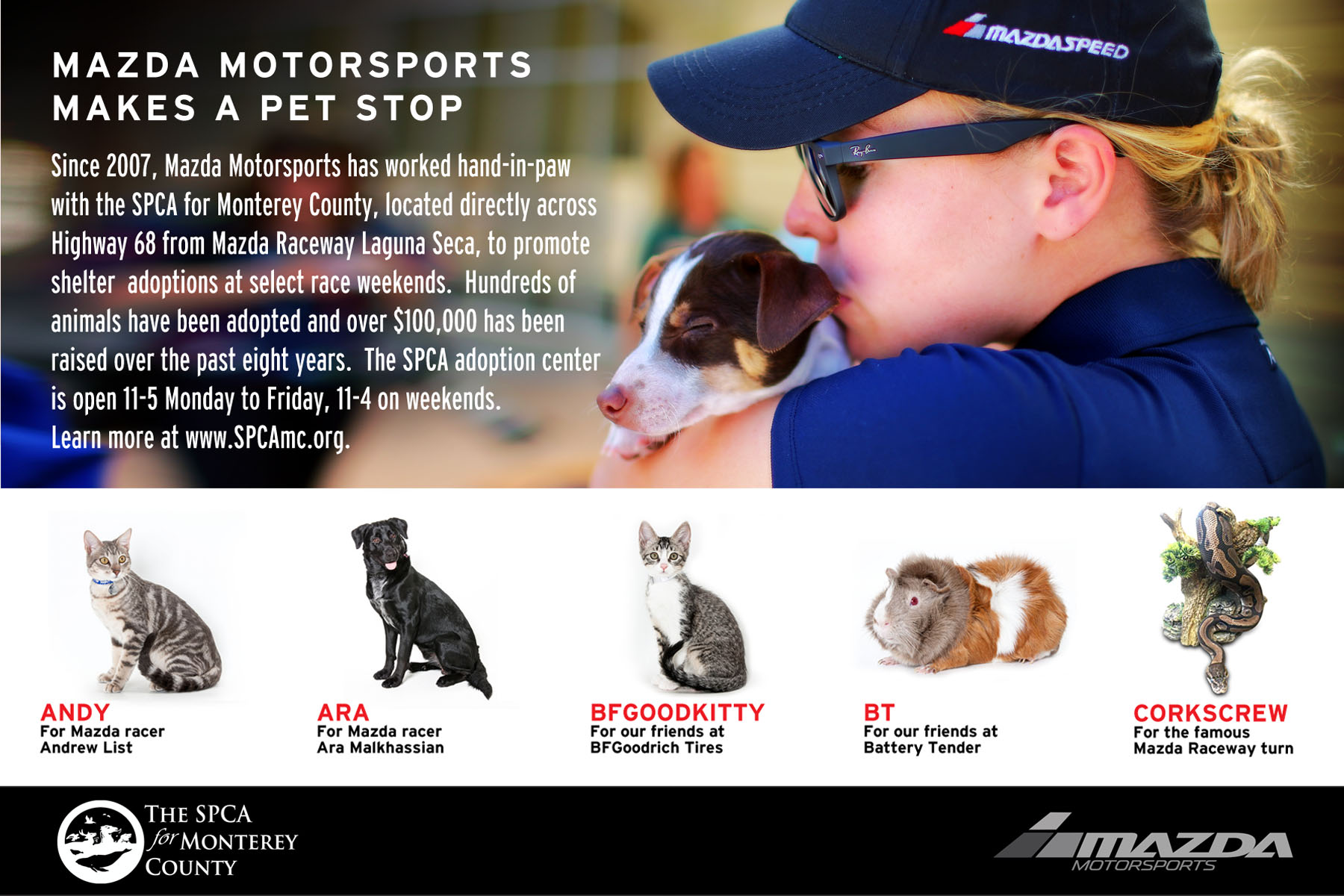 The past few years, Mazda has created a flyer and online ad featuring many of the adoptable animals, nicknaming them something that relates to the car company. What you see above is a small part of the presentation from last weekend.