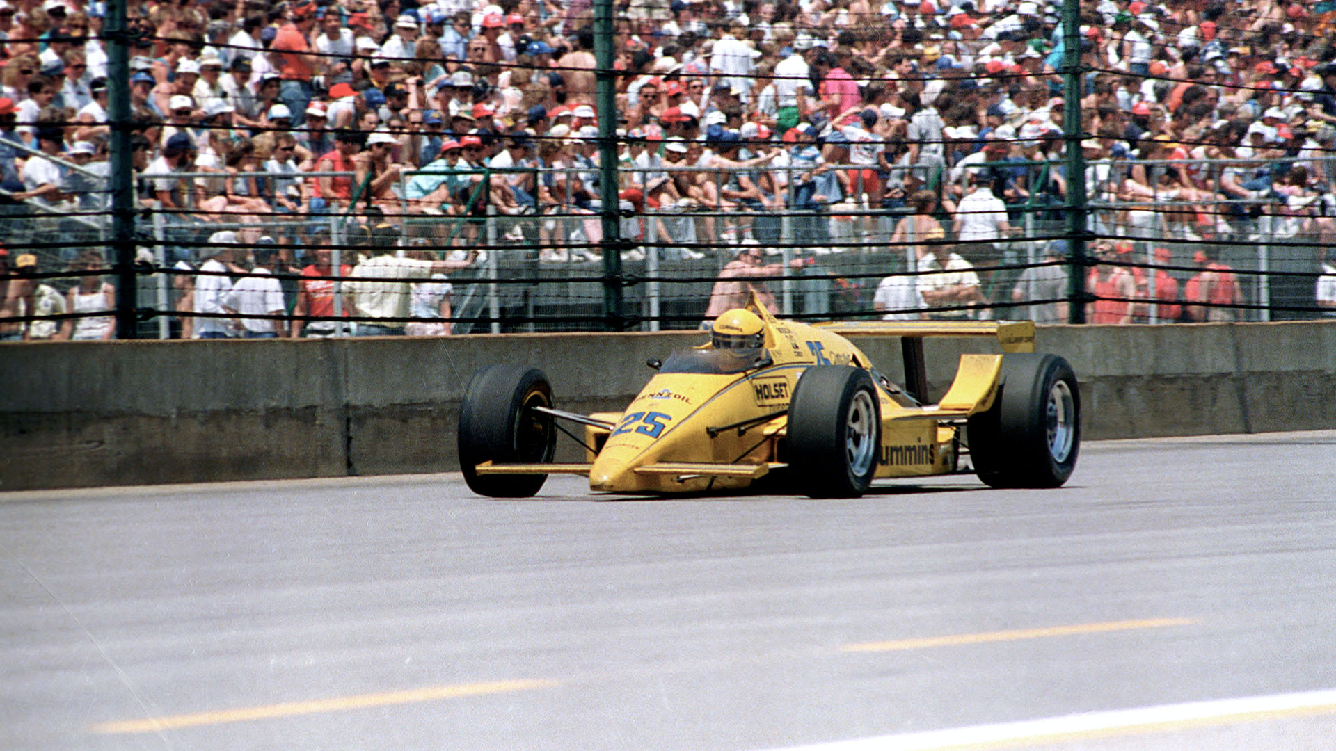 For most of the 1987 race, it appeared that no one would catch Mario. He led 170 of the first 177 laps—at one point, for 80 laps in a row. Tragedy struck along the way. A spectator was killed when an errant wheel went hurling over the catch fence and into the crowd. Cops had their work cut out for them too, arresting over 100 fans for public intoxication. Late in the afternoon, with 23 laps to go, the Andretti Curse did Mario in once again; his car failed, leaving the race wide open. Roberto Guerrero took over first, with Al Unser Sr. behind him. It looked to be Guerrero’s race to lose, but Unser was pushing hard. In the press booth, Jim Lampley had this to say: “[If] Al Unser Sr. wins this race, you can make a strong case for him as the greatest Indianapolis 500 driver of all time.” Pick up the action in the final laps here: