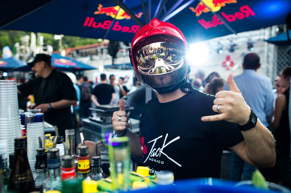A bartender wears one of the unique Automobile Club de Monaco marshal helmets as he makes drinks for race fans at one of the many bars along the circuit. Monaco has a fun and unique nightlife that allows fans to enjoy a beer (or three, or twenty) along the race track itself.