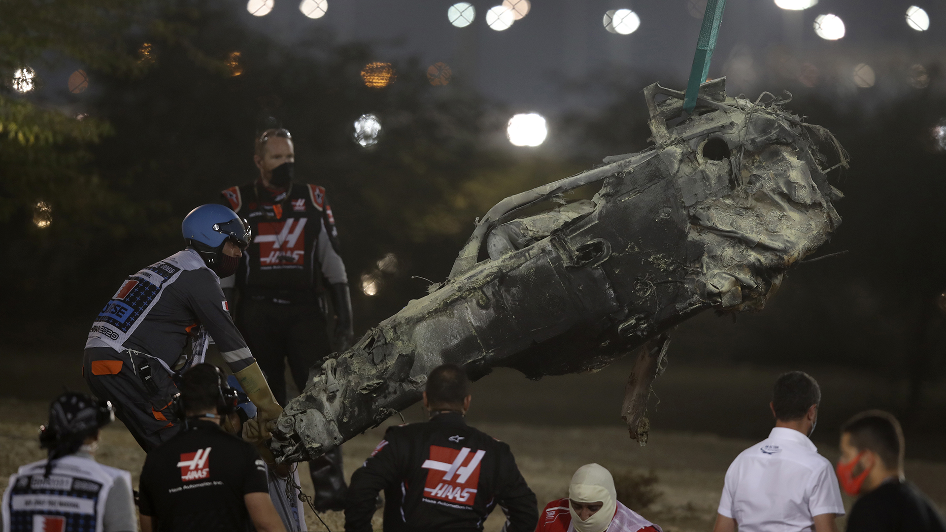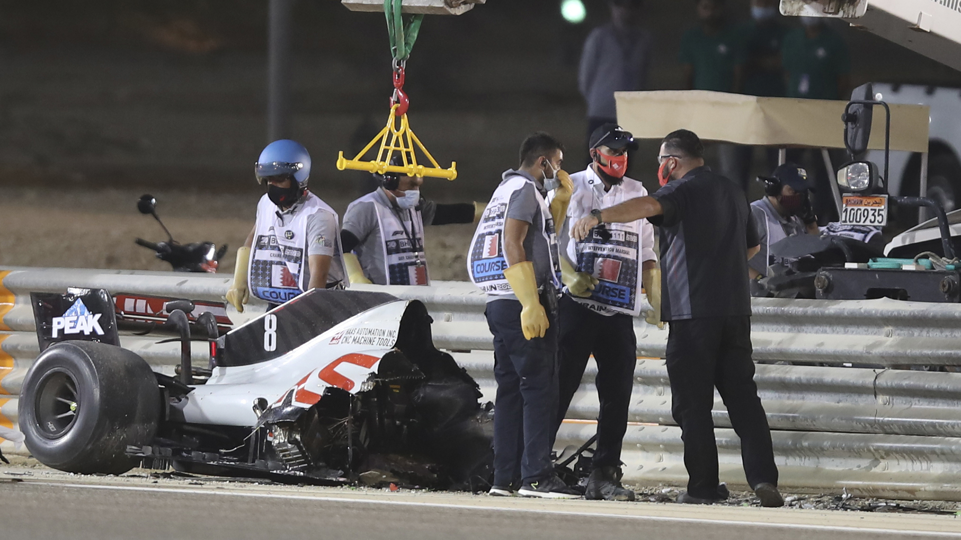 Seldom has a driver walked away from a crash as severe as the one U.S.-based Haas Formula 1 driver Romain Grosjean suffered in the opening moments of today’s Bahrain Grand Prix when he veered off track and drove directly into a three-tiered Armco steel barricade. His car split in half and immediately exploded in flames, the rear end bouncing back onto the track and the front punching a hole through barrier and carrying Grosjean to the other side.