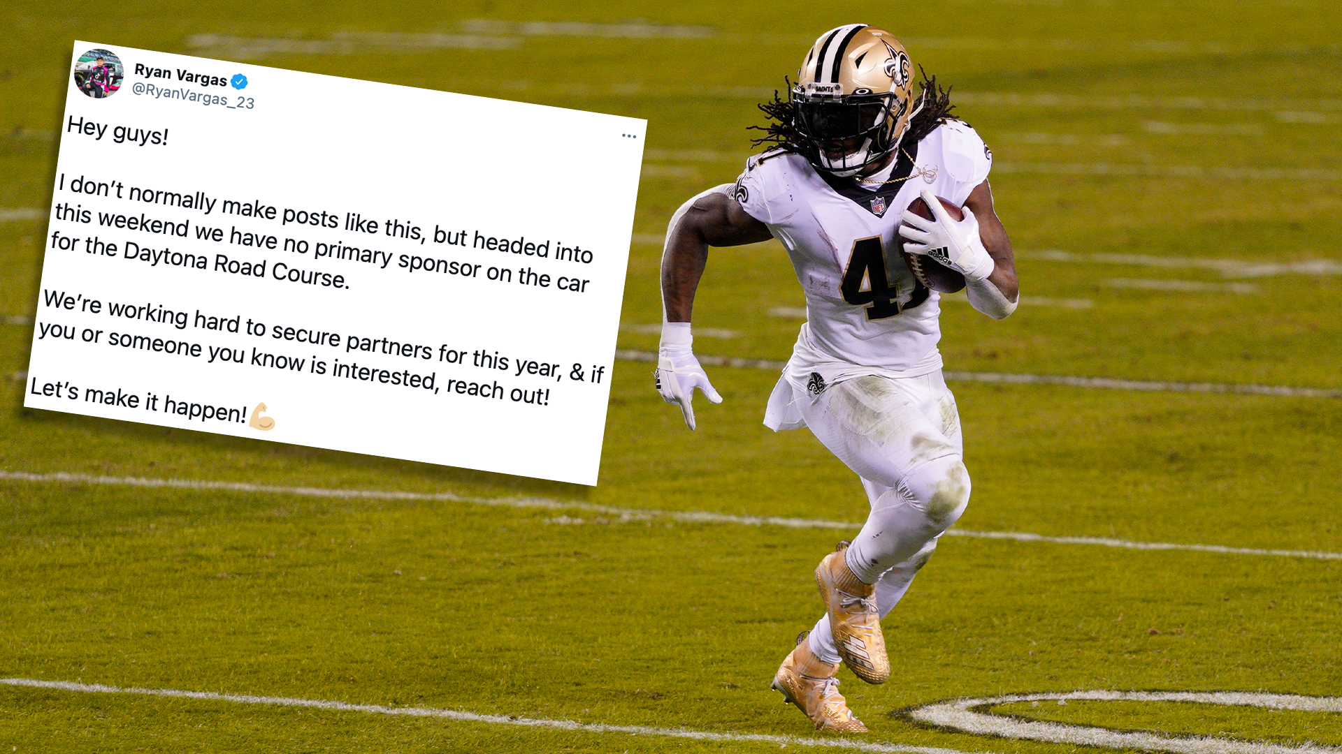 Kamara is coming off the best season of his career with the New Orleans Saints, rushing for 932 yards on a pass-happy offense led by future hall of fame quarterback Drew Brees. As for Vargas, he placed 18th at last weekend’s Daytona Xfinity round and is kicking off his first full-time season in the series. He was famously sponsored by TikTok last season, which is pretty on-brand for a 20-year-old.