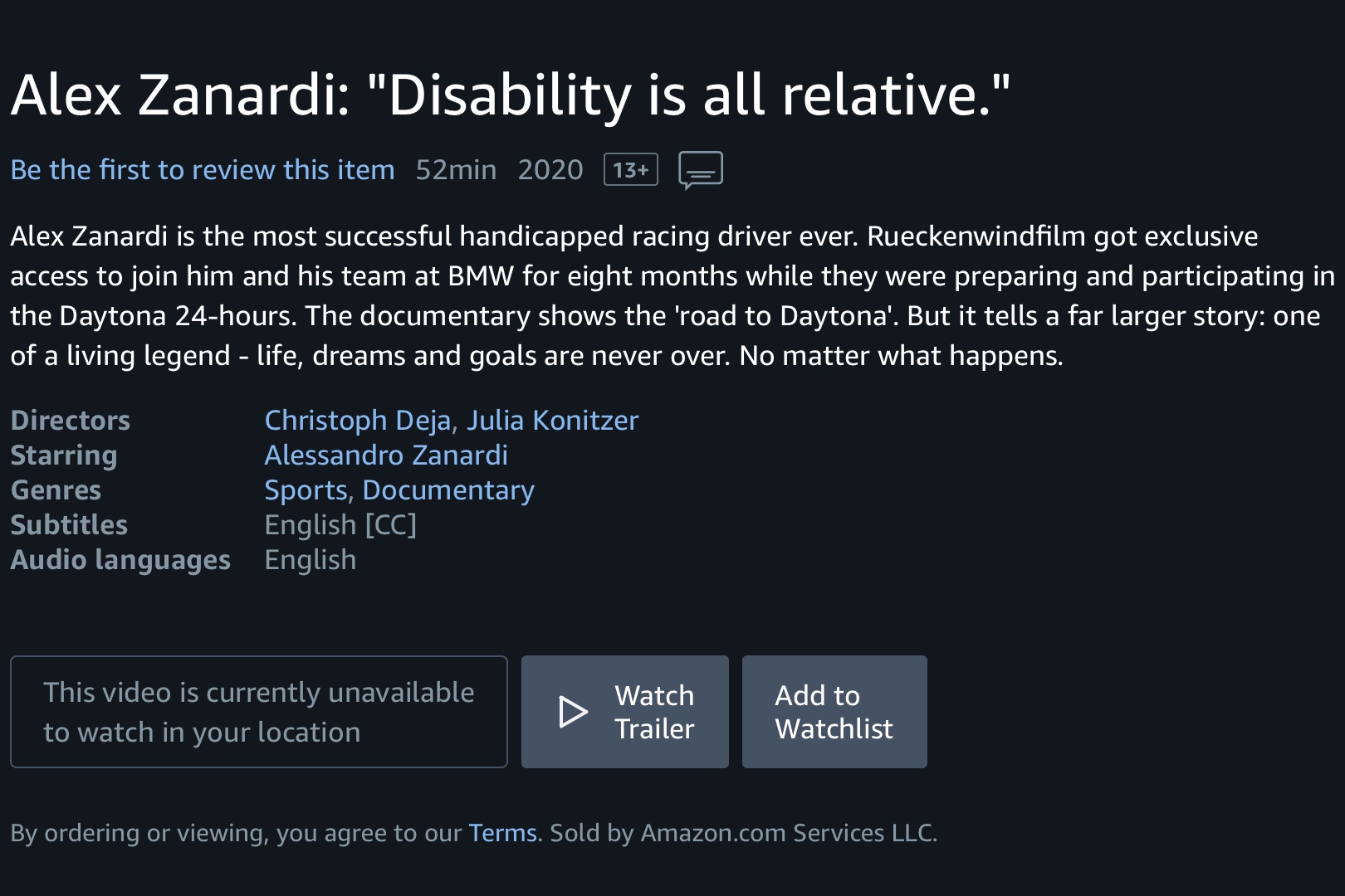 Last weekend, there was a fair share of coverage around the new documentary scheduled for debut Sunday, May 2. Alex Zanardi: “Disability Is All Relative” is a 52-minute documentary highlighting the Italian’s multi-month preparation for 2019’s 24 Hours of Daytona. According to one of the film’s production partners, BMW, the film debuted last Sunday on a broadcast in Germany and was meant to become available for Amazon customers there, in the United Kingdom, and the United States. Look up the title in Amazon’s library, however, and you’ll find it unwatchable, with its play button greyed out with the message “this video is currently unavailable to watch in your location.”