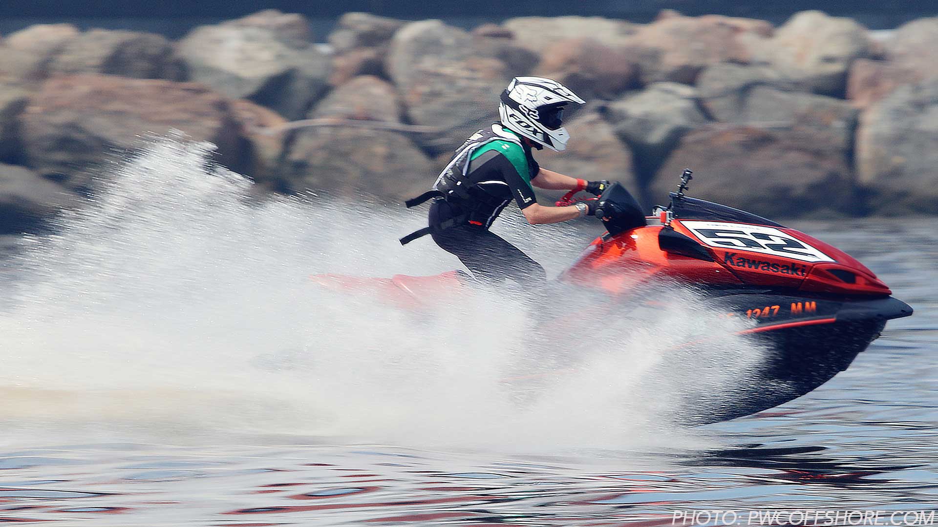 Around me the field lines up in a viscous brown broth of Long Beach Harbor after a rain. Thirty-three racers who stared down foul weather reports and showed up anyway, popping and gurgling and side-eyeing each other in motocross gear and wetsuits. All but a handful own their boats, know their machines inside and out. All but one knows what they’re doing. And that’s me.