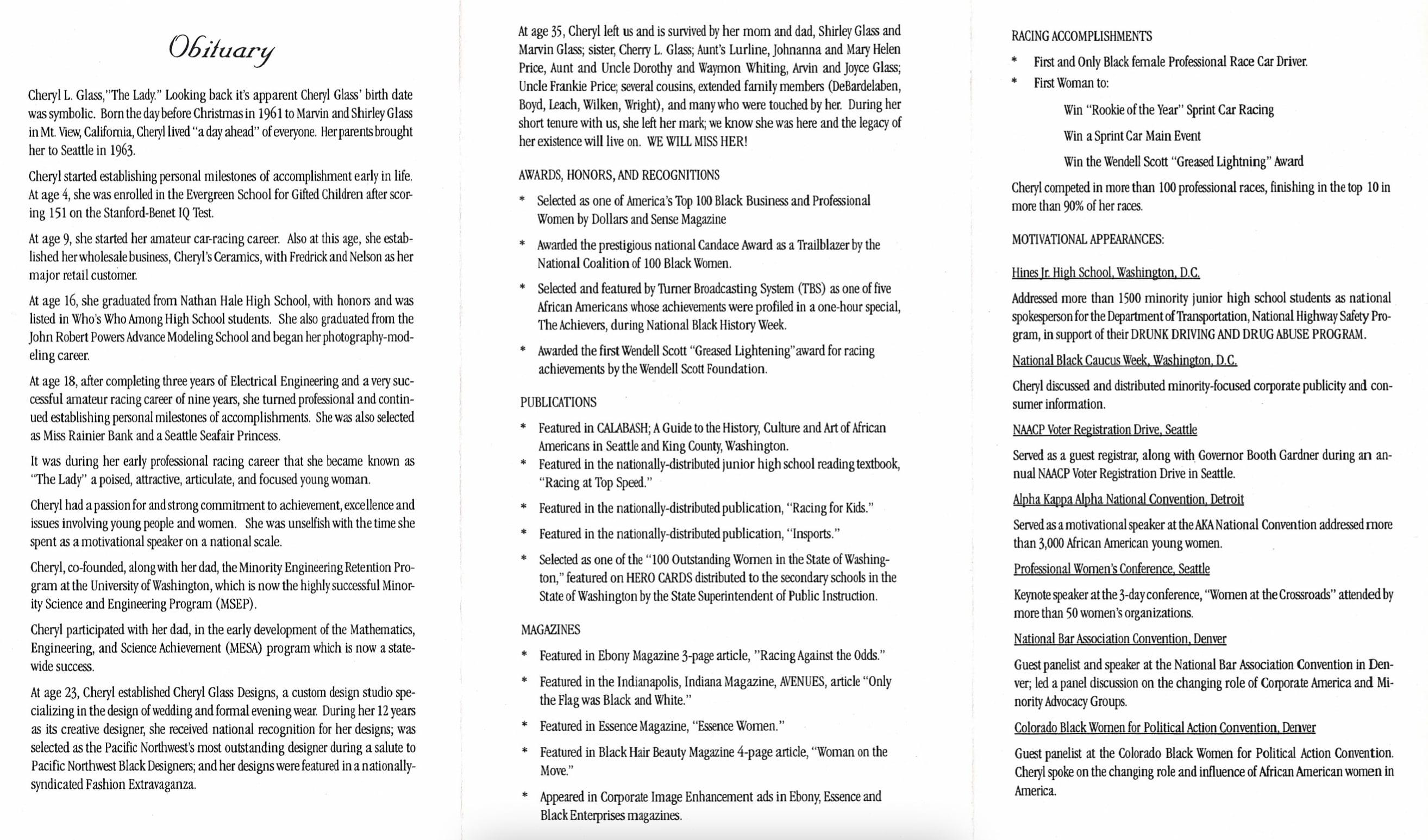 A January 1980 edition of Ebony still provides one of the most thorough looks at Glass as an entrepreneur, model, and successful racing driver when she was still alive. She was only 18 when it was written—barely at the start of her career.