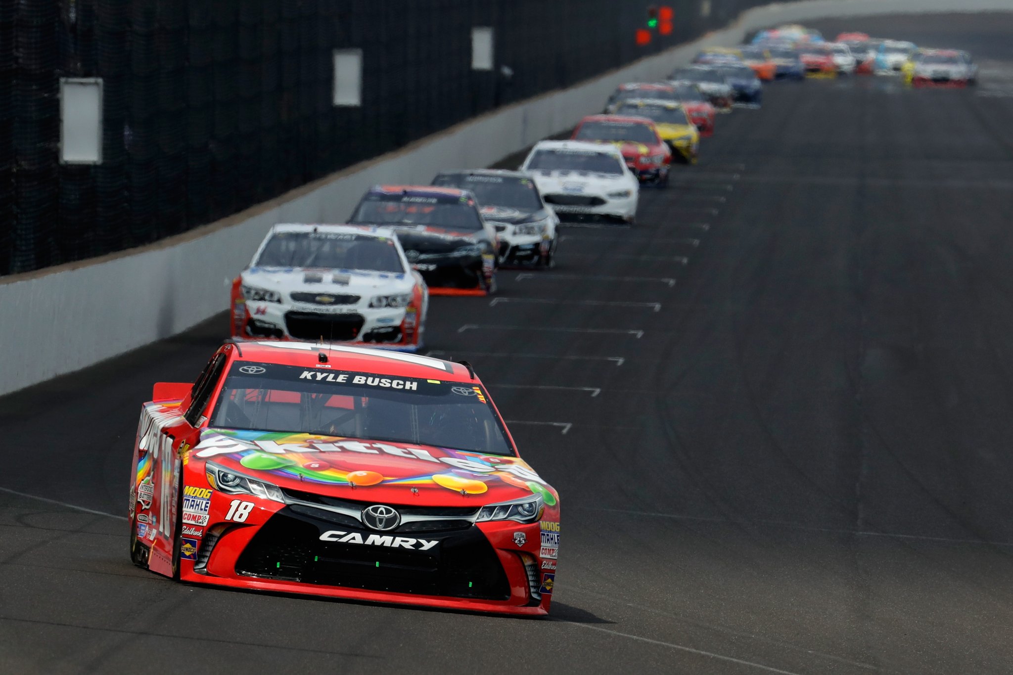 But that’s what happened: Busch and the number 18 Joe Gibbs Racing Skittles Toyota started from the pole, led 149 of 170 laps – the most ever in a NASCAR race at Indianapolis Motor Speedway – and though some late-race cautions bunched up the field and allowed teammate Matt Kenseth to keep taking shots at Busch, in the last overtime green-flag couple of laps, Busch pulled out so far ahead of the rest of the pack that it was hard for NBC to get them all in the same picture. That far ahead in two laps. Seriously. Kenseth was second, Jimmie Johnson third.