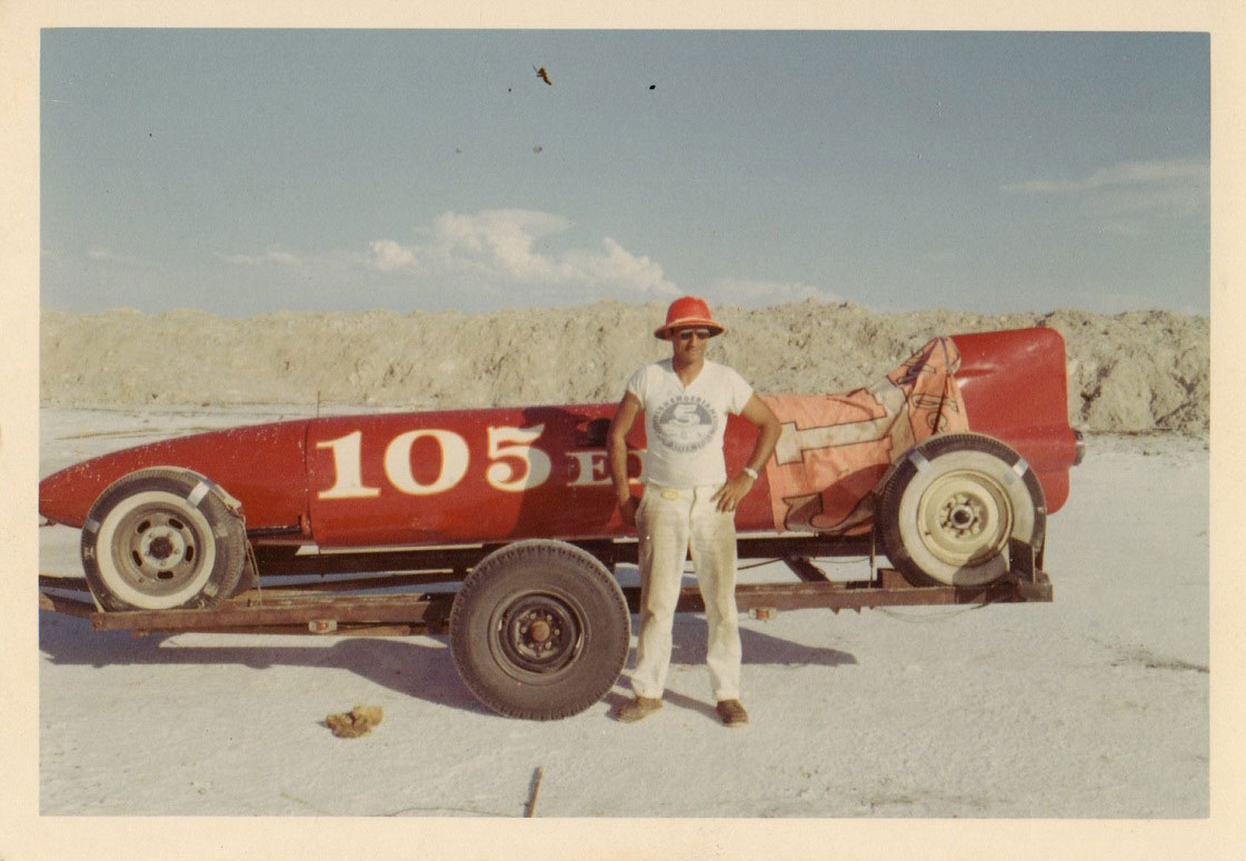 In the spirit of those times, we have Something, which is exactly what it sounds like. Built by Jerry Silverstein, Julian Doty, and Arnold Birner for 1962, the body is “a surplus WWII aircraft drop tank, which has been augmented here with an extended tubular frame covered with custom-fabricated panels.” The engine is a four-cylinder, scavenged from a Pontiac Tempest, onto which an unspecified but impressive-looking turbocharger setup was “added somewhere along the way.” The transmission is three-speed manual transaxle, the rear end is designed to accommodate a parachute, and the whole thing rolls on 15-inch discs wrapped in vintage Firestone slicks.