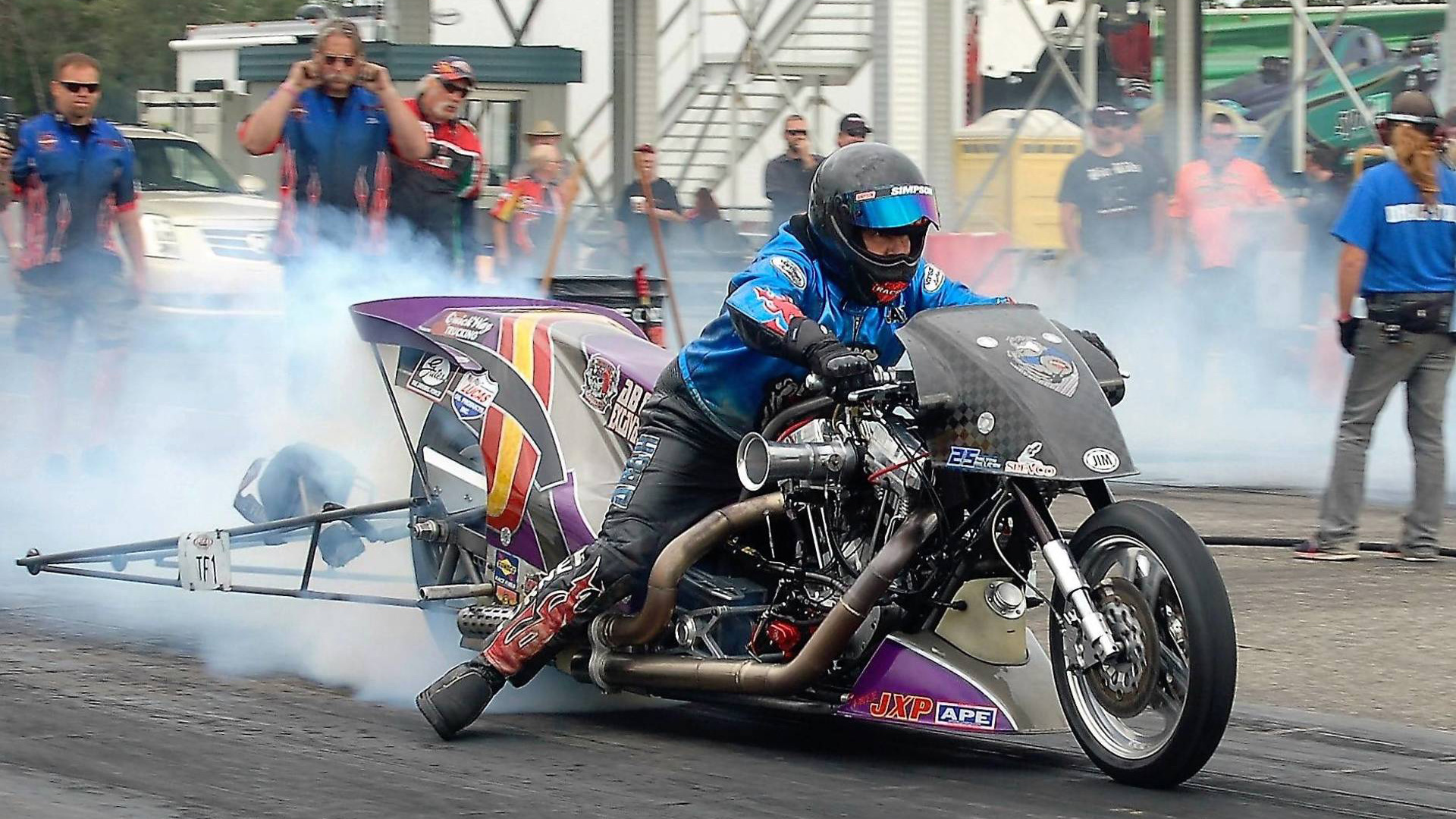 Tough guys. North Carolina businessman Tii Tharpe fell off his Nitro Harley at the IHRA World Finals in Memphis, going 217 mph. Seven days later he got back on the bike at Rockingham, North Carolina. He qualified fourth.