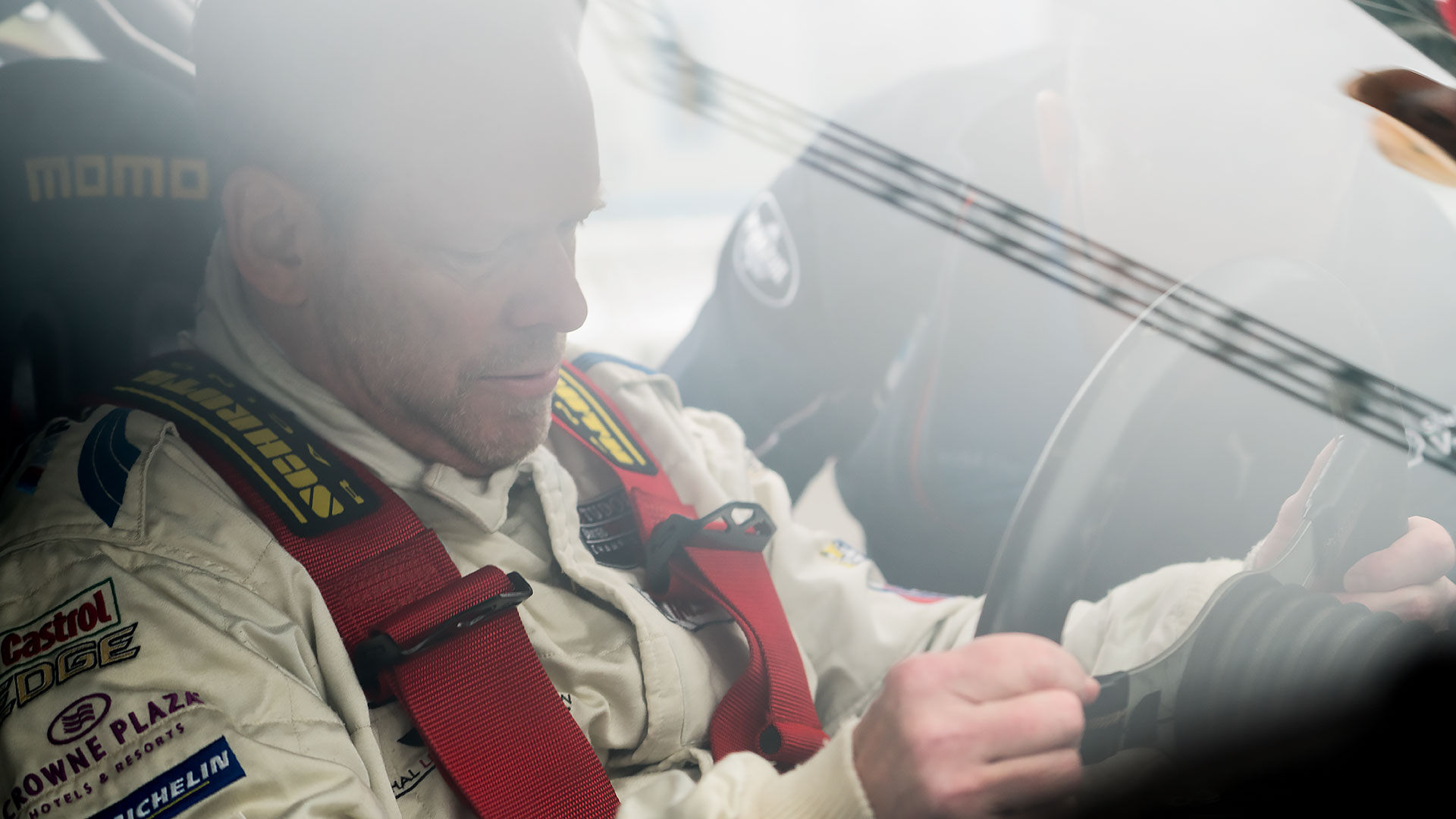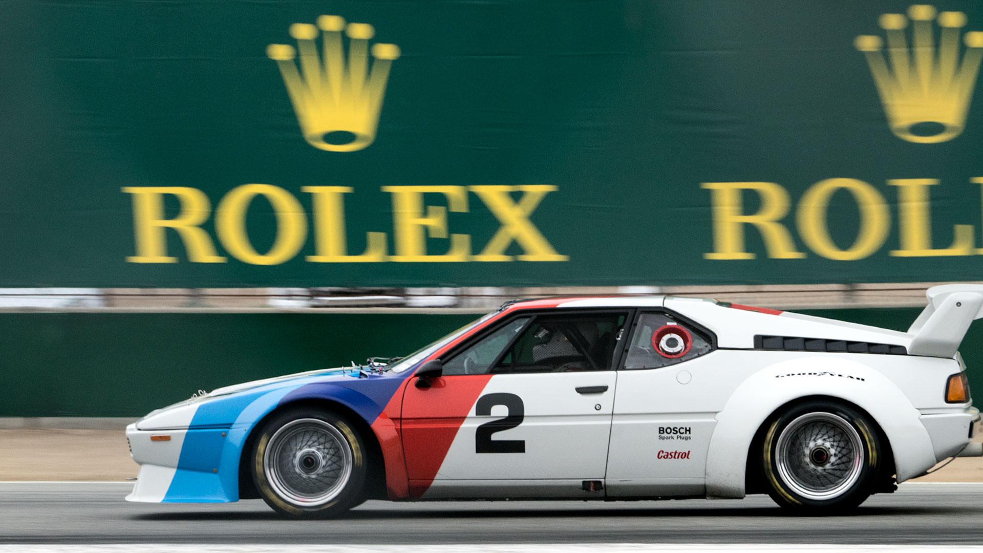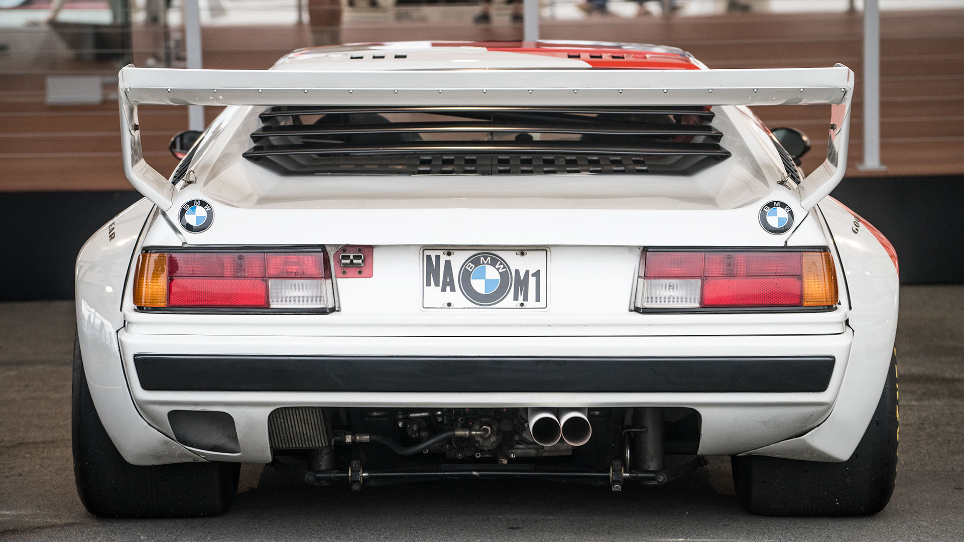 With some 45 cars in my class—1973-1981 FIA and IMSA cars—it’s crowded as a Fourth of July beach out here, including a few overly oiled-and-muscled types. That includes a seven-strong contingent of Porsche 935’s. Cranked to roughly 700 horsepower, compared to 480 for my Giugiaro-designed M1, the 935s dominated at Le Mans and won the 24 Hours of Daytona six years running. There are Porsche RSR and RSR 3.0 Carreras, a racing Datsun 280Z. On the homegrown front, there’s an ’82 Mustang, a ’76 Corvette and ’77 Corvette Greenwood. I’m definitely loving the blurry, nostalgic view, and the unholy wail of the BMW’s 3.0-liter inline six that’s nestled behind my helmeted noggin.