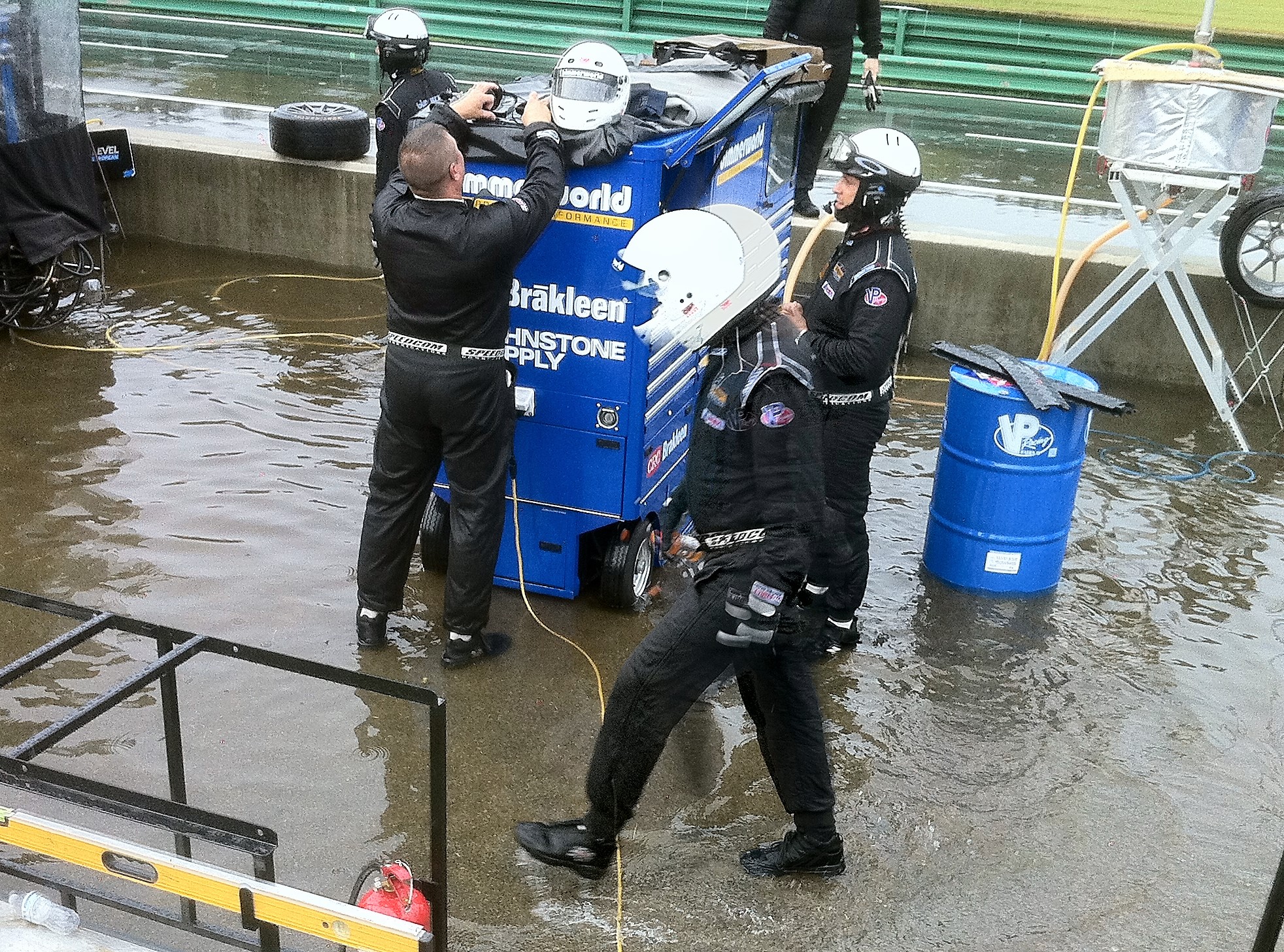 Fine for the racers, but not so fine for some of the pit crew, which found themselves slogging around in nearly a foot of water trapped between the concrete wall and a building. Fortunately, there were enough live electrical wires to follow to safety…