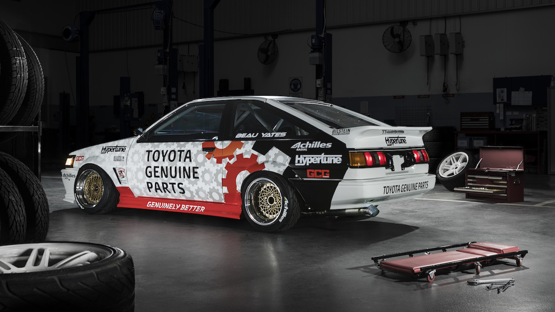 Yates has owned the car since 2003, and drove it to the WTAC drift title in 2006, but totaled it crashing out of a race in 2013. So began the journey to build the perfect Hachi-Roku. The result is next-level stuff, the product of a painstaking thee-year-long restoration project in conjunction with Toyota Genuine Parts. That means every piece the shell—body panels, trim pieces, lighting, grille, and structural pieces like the strut towers and frame rails—are legit off-shelf components. Onto the rock-solid base went a heaping of aftermarket parts, suspension and aero and all the requisite safety kit. The beating heart is a 2.0-litre 3S-GE four-cylinder, the venerated BEAMS engine, totally built from covers to crank and heavily turbocharged.