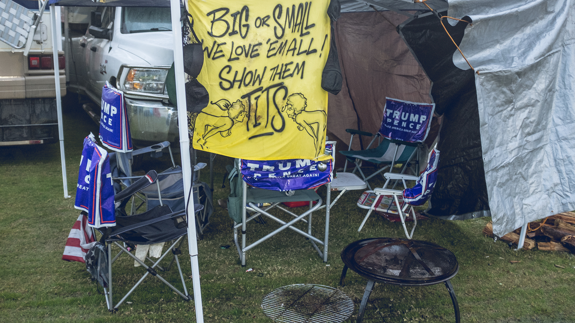 Every fist clenches a cigarette and a coffee, or a cigarette and a beer. Gadsden flags and German flags and Confederate flags and Continental tire flags and Mazda flags all hang, soaked, in equal numbers. Daytona is a remarkable place.