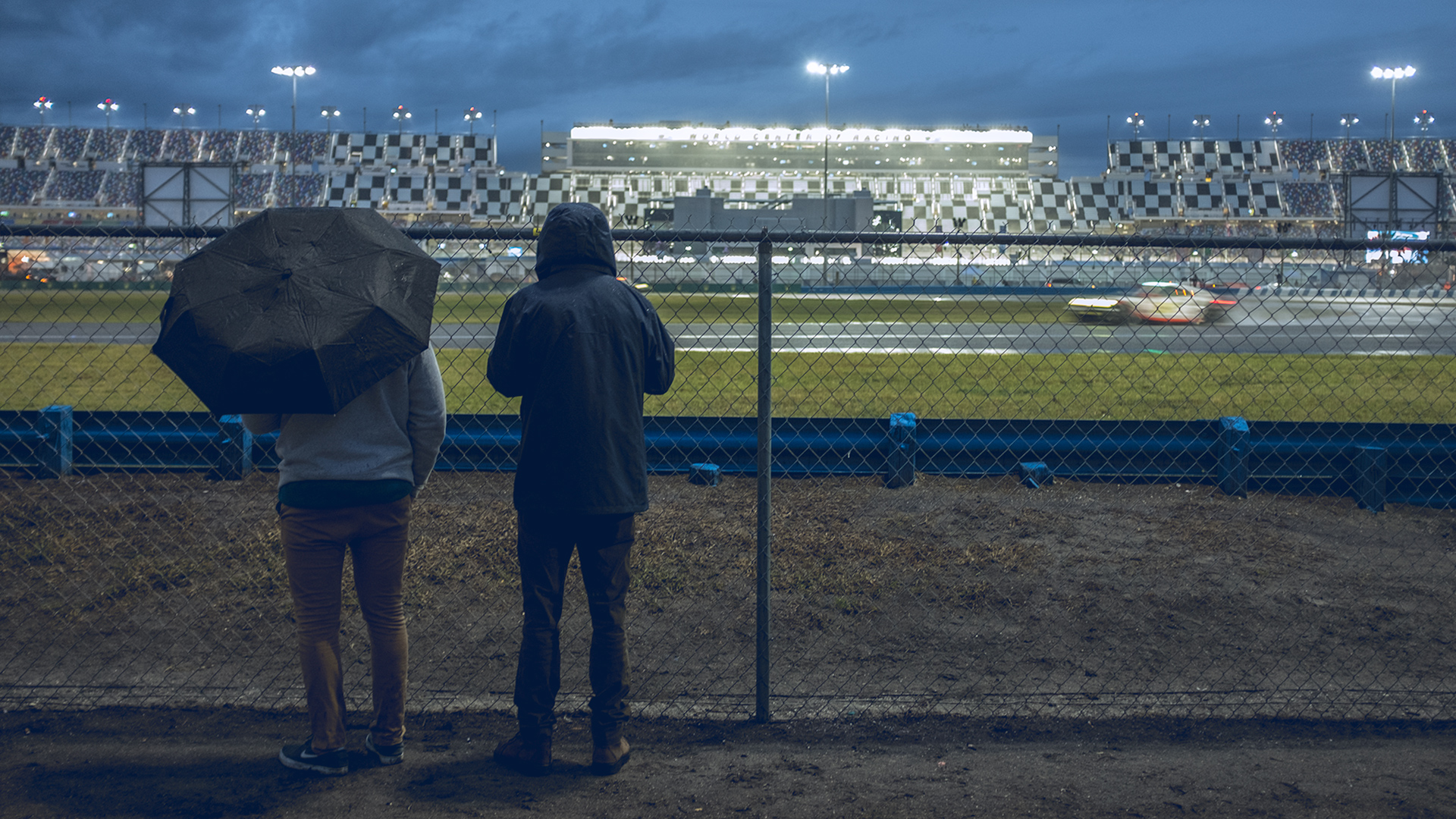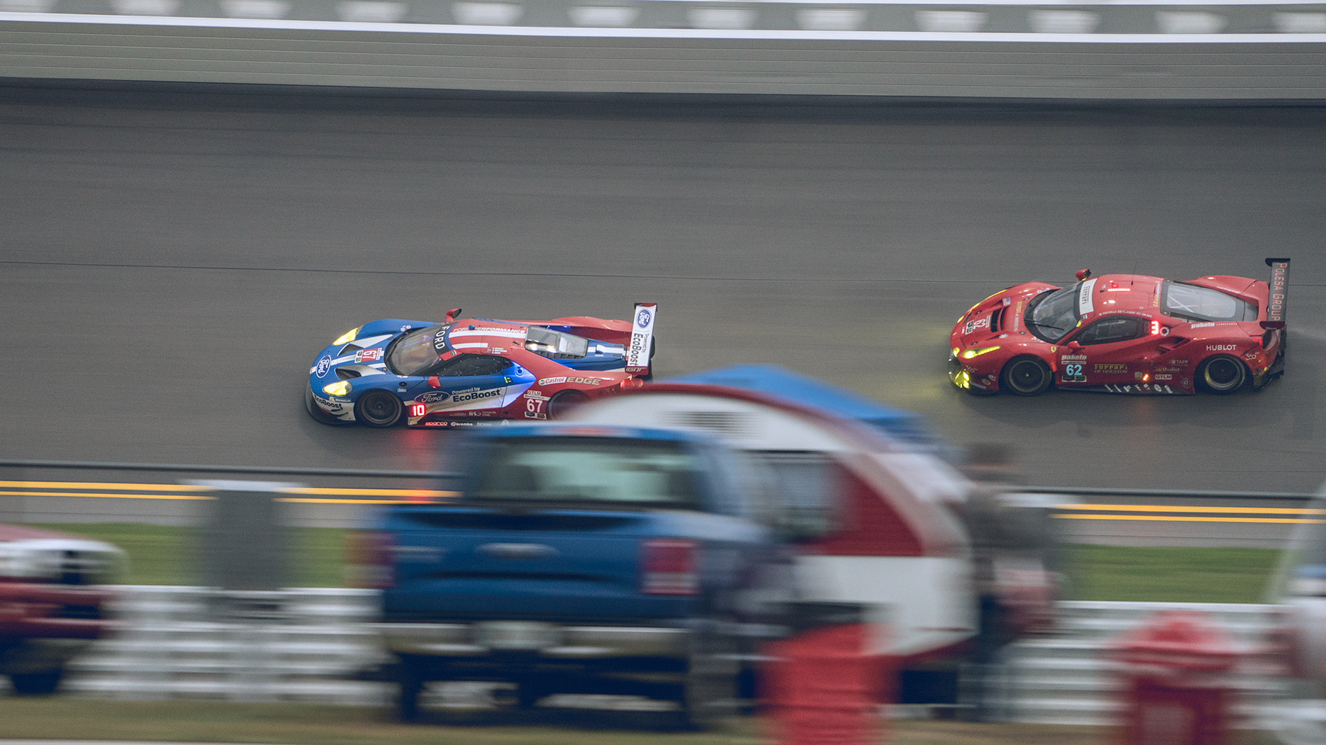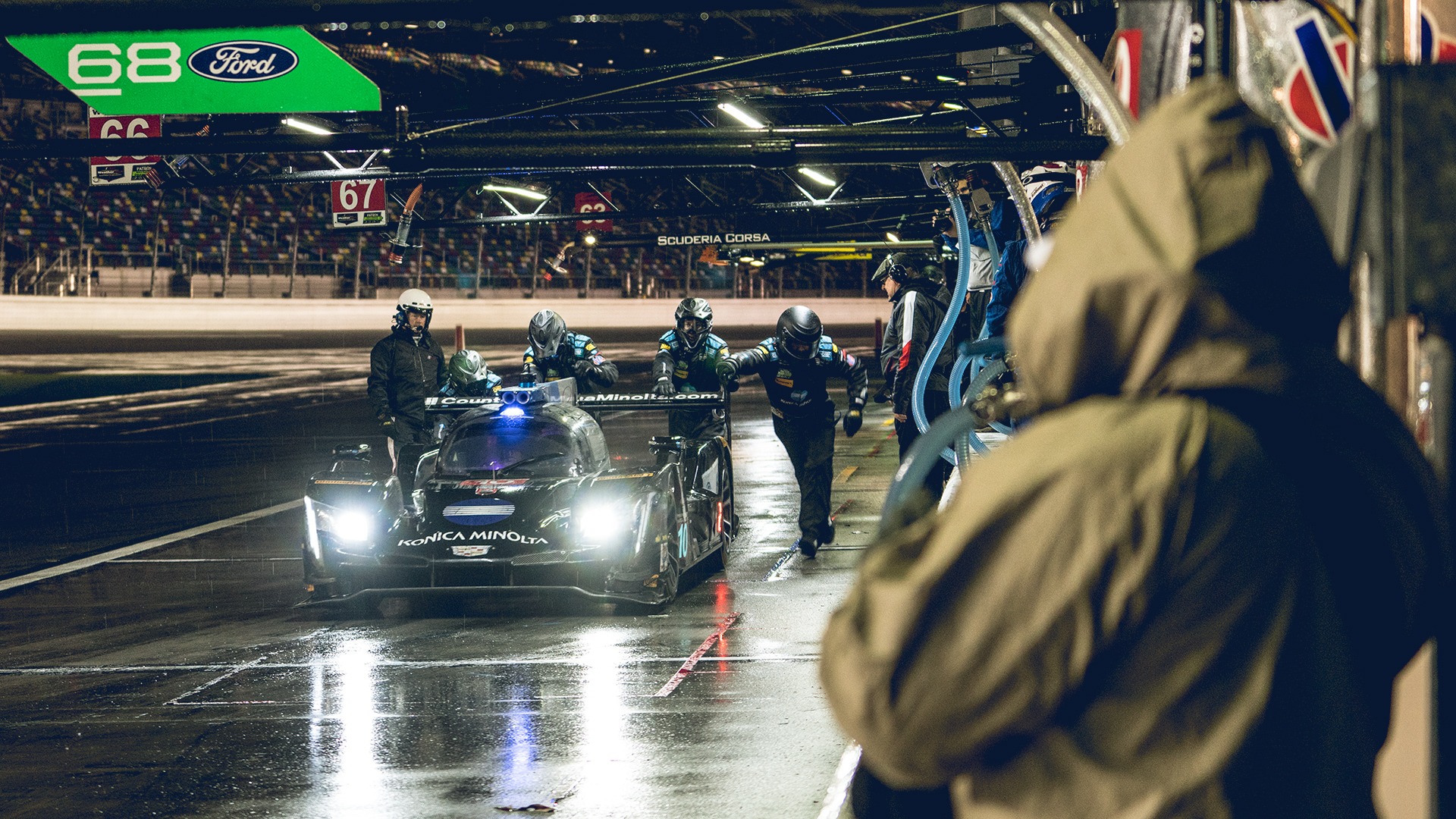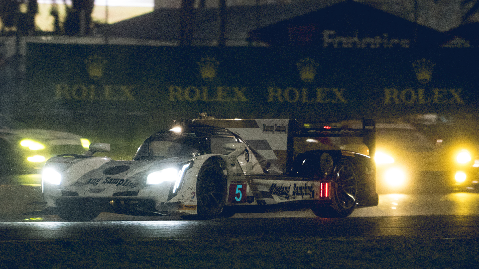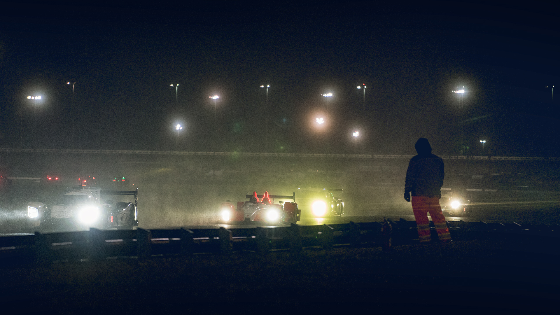 Daybreak over Daytona was as clear and bright as you could ever ask for. Perfect racing weather for a Rolex 24. Cool. Quick. By noon clouds had shifted overhead, and by the 2:30pm race start teams were already speculating on the outcome, should rain start rolling in. Just a few laps later, it’s apparent that it will.