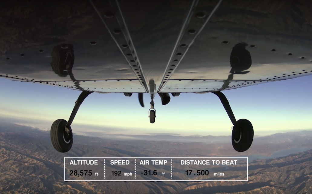 This video tracks his endeavour, from planning to decent. From roughly 36,000 feet, Stumphf plunges at 160 mph over the mountains, through a balmy atmospheric temperature of -52ºF. When all’s said and done, he has successfully traveled 18.257 miles across the California landscape.