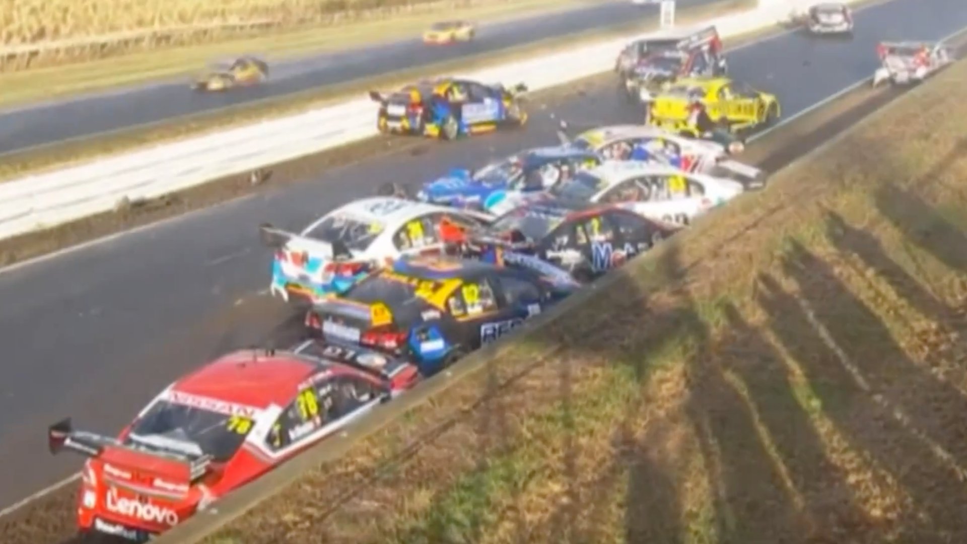 The race was being held in the rain at Symmons Plains on the island of Tasmania. According to The Daily Telegraph, the crash created more than 9Gs of force. A red flag was dropped after the pileup.