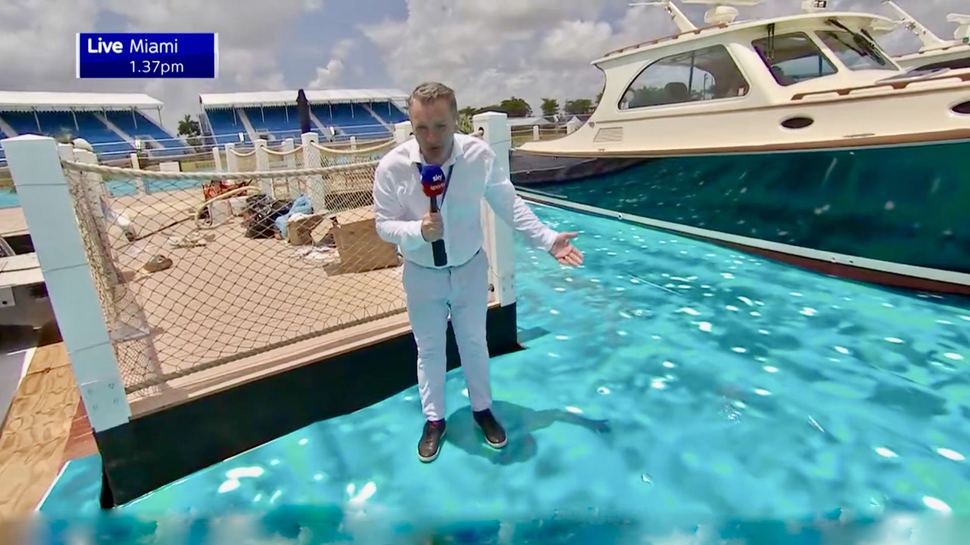 As you can see in the video below, it’s nothing more than a huge graphic adhered to the ground that makes it look like there’s actual water flowing around those strategically positioned boats on one end of the marina. At this point, I’m not even sure if the sand on the infield “beach” on the opposite end of the marina is real. Maybe the sand is also a graphic, or maybe it’s sawdust. I don’t know. But I can see some beach huts and lounge chairs in the background, so maybe they actually expect people to lounge fake-waterside? Again, it’s unclear.