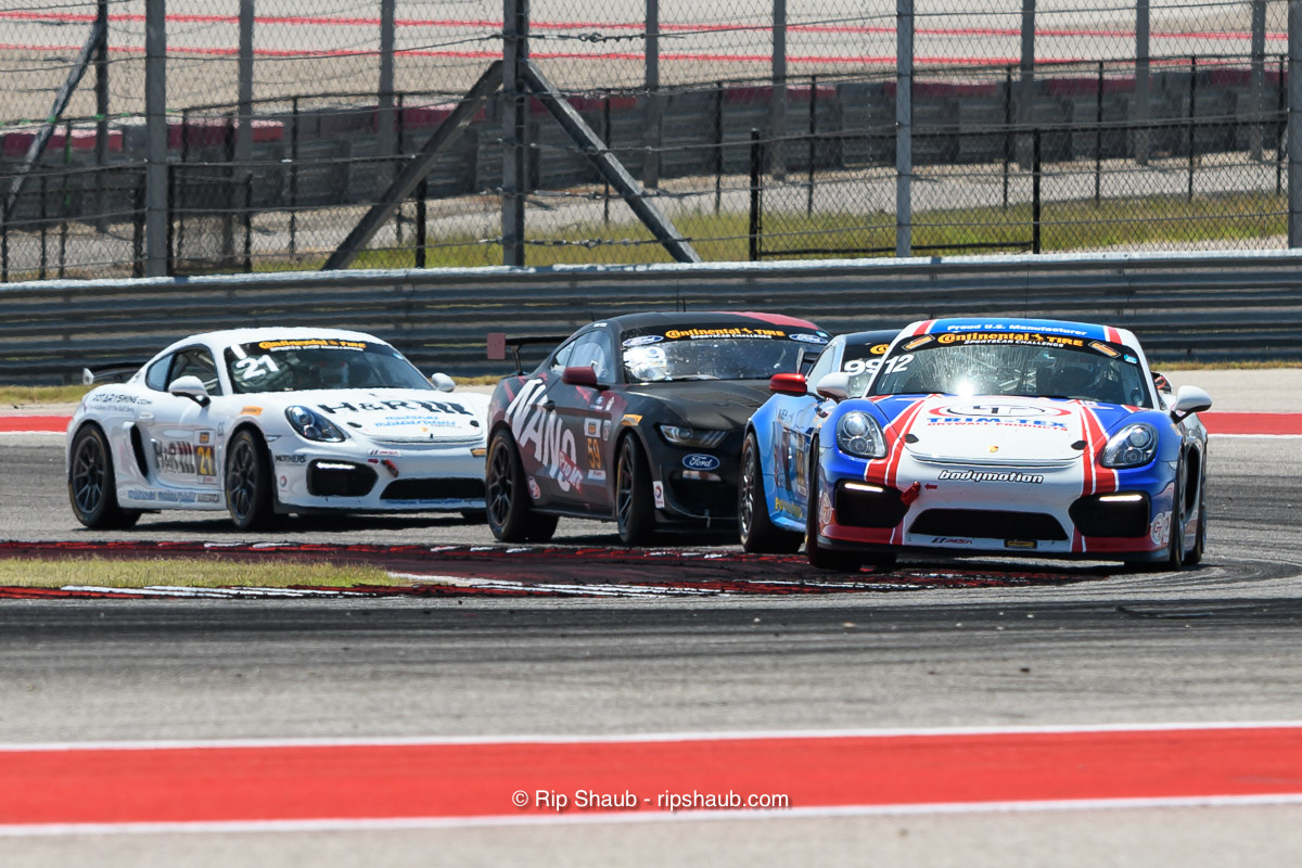 A pair of Porsches, An Aston Martin Vantage and a Ford Mustang GT4 crowd into Turn 8., © Rip Shaub – All Rights Reserved