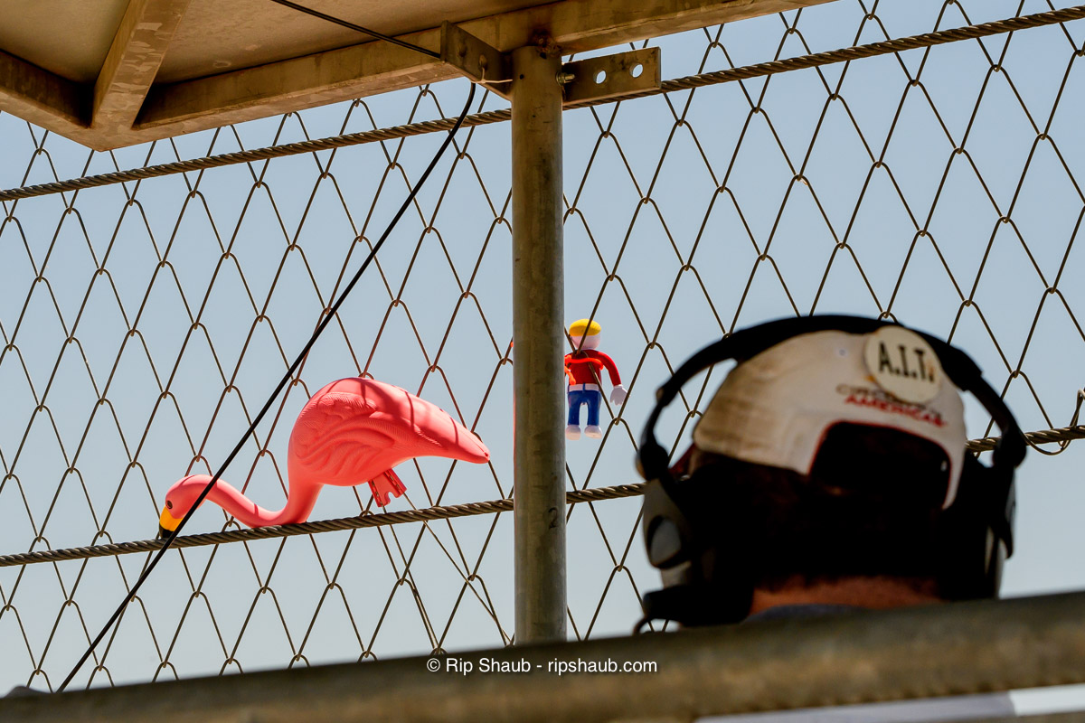 Track workers decorate their flag stands for televised races. The Turn 20 crew has brought along Mr. Bill and a pink flamingo to enjoy the action., © Rip Shaub – All Rights Reserved