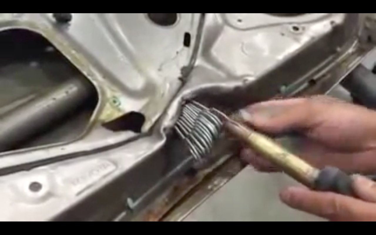 The second thing is that the operator of this tool is attaching key-like objects to the dent with a buzzing tool that appears to be using some form of arc welding to melt together the tips of the “keys” and the surface of the dent. When the full length of the dent is covered in a row of the “keys,” a tool is slid into the series of holes on the ends of the keys, and a puller is mounted. The puller then begins to yank the middle of the dent out using the rod and keys, and when the center of the dent is partially pulled out, the operator slides the rod in all the way.